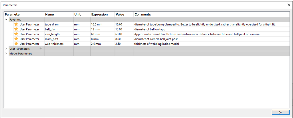Model je plně škálovatelný, takže můžete snadno upravit primární rozměry ve Fusion360, pokud máte jinou velikost rámu/trubky nebo jinou velikost koule a objímky na vaší kameře.