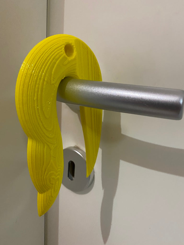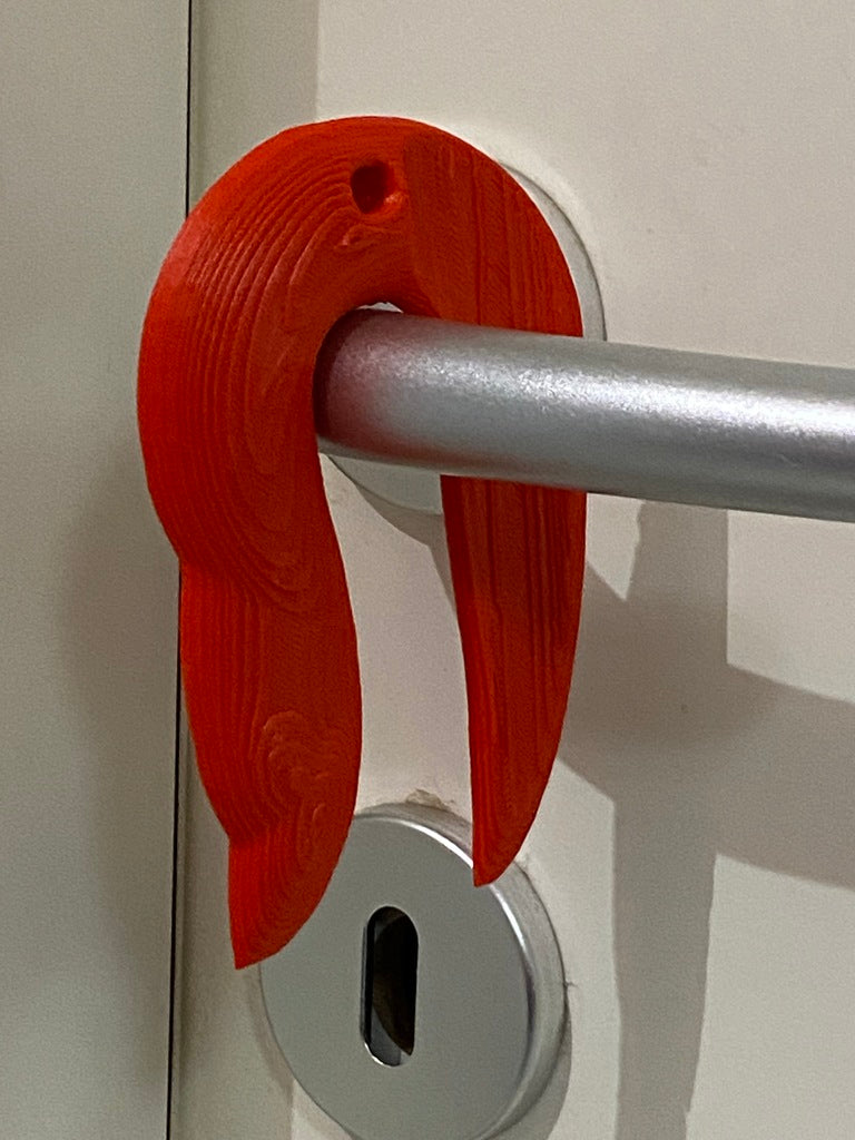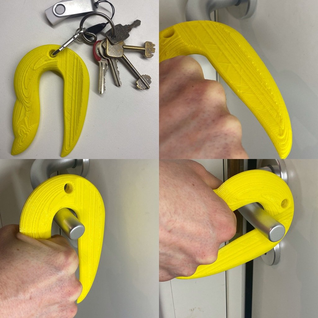 Toto je Toucan saw grabber, přívěsek na klíče, kterým můžete otevírat dveře, aniž byste se dotkli kliky. Je vhodný pro praváky i leváky. Podívejte se, jak se používá, v těchto videích: