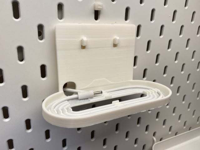 Jednoduché řešení montáže rozbočovače Nest / Google Home Hub na desky IKEA Skadis. Rozbočovač se umístí co nejblíže k desce a kabel lze vést jedním ze stávajících otvorů Skadis, takže žádné dráty nejsou vidět. Vyžaduje dva univerzální háčky pro úhlednou instalaci.