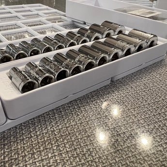 Tento organizér je navržen tak, aby držel 1/4" klíče ze sady Harbor Freight, a poskytuje strukturované řešení pro ukládání. Je kompatibilní se systémem Gridfinity, který umožňuje uspořádané a modulární uspořádání ve vaší sadě nářadí nebo zásuvce. Držák je vyroben s přesnými rozměry, které zajišťují, že vaše SAE a metrické klíče zůstanou bezpečně na svém místě, aniž by se kutálely, a zároveň je lze snadno vyjmout. Hloubka tohoto modulu je optimalizována tak, abyste na něj mohli umístit další úložná řešení Gridfinity, čímž maximalizujete využití prostoru 1x4. Podporuje širokou škálu velikostí nástrčných klíčů, včetně nejběžnějších rozměrů SAE (3/16" až 9/16") a metrických (5 mm až 14 mm).