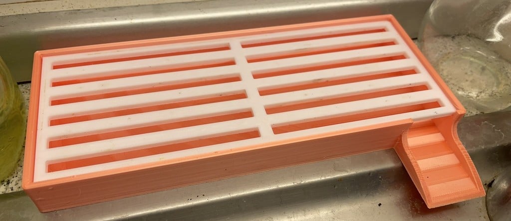 Rozměry organizéru jsou dobře promyšlené, aby se vešly do většiny standardních kuchyňských dřezů. Základna měří 8 cm x 20 cm x 2 cm a obsahuje odtok o délce 3,5 cm a šířce 3 cm. Samotný stojan měří 7,4 cm x 19,4 cm a držák na láhve má výšku 13,8 cm, což poskytuje dostatek místa i pro vyšší láhve.
