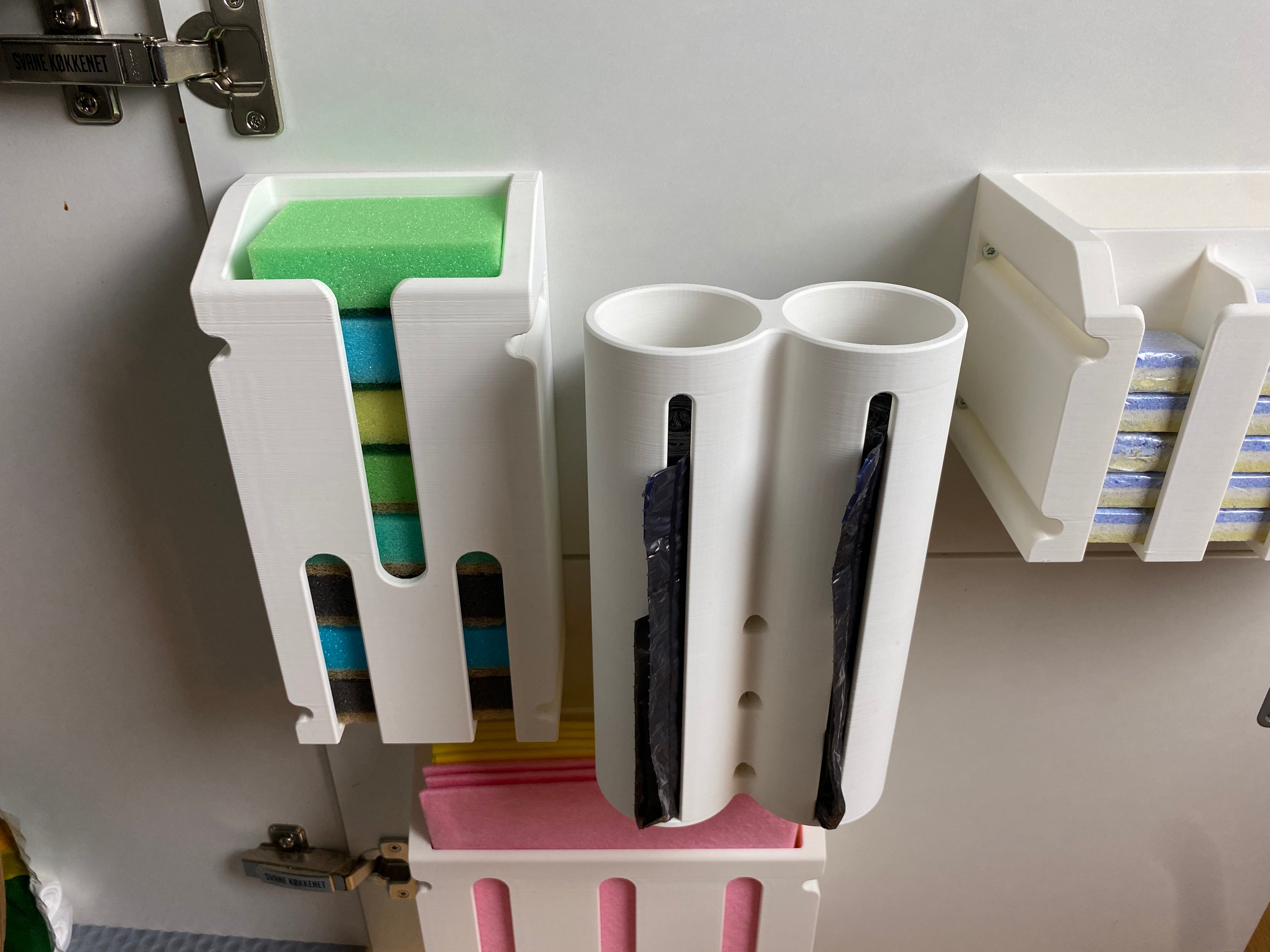 V tomto balíčku naleznete držák na mýdlo na nádobí, praktický držák na houbičky, držák na utěrky na nádobí a také chytré řešení pro skladování odpadkových sáčků. Tyto komponenty spolupracují na vytvoření uklizené a funkční kuchyně, kde snadno najdete to, co potřebujete. Je to opravdový kuchyňský hack pro dosažení většího pořádku.