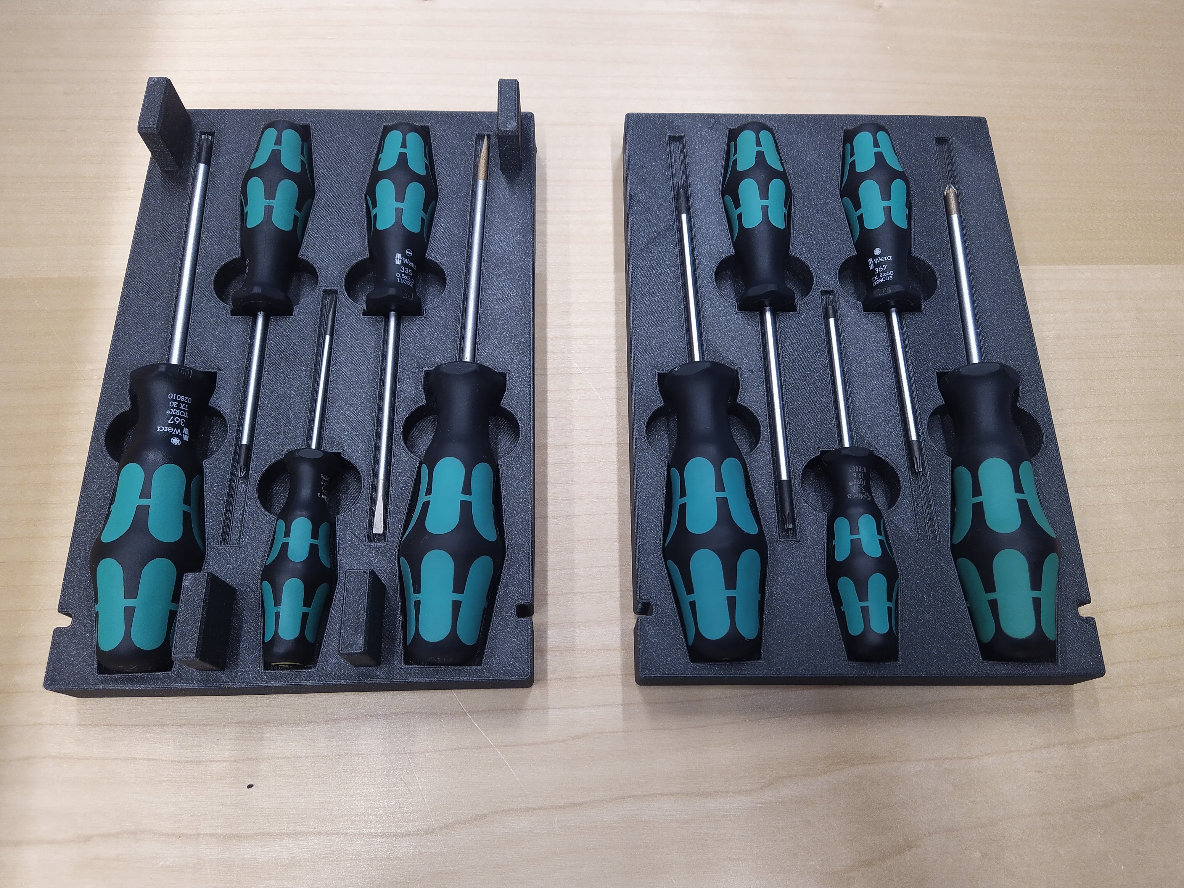 Tento stohovatelný podnos je navržen pro efektivní uspořádání vašich šroubováků. Je speciálně upraven pro uložení tří hlavních velikostí rukojetí a délek čepelí WERA. Každý podnos pojme 2 velké (čepel 100 mm, rukojeť 98 mm), 2 střední (čepel 80 mm, rukojeť 81 mm) a 1 malý šroubovák (čepel 60 mm, rukojeť 70 mm).