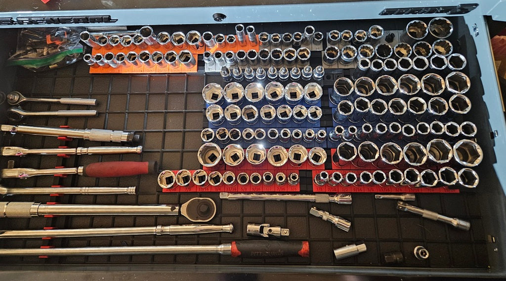 Držák nástrčných klíčů TrackTwist Sokkelholder V2 je navržen se zmenšeným profilem, který bez problémů zapadne do běžných zásuvek, včetně 4palcových zásuvek, a to i s hlubokými nástrčnými klíči do 3,25 palce. Je také kompatibilní se systémy Gridfinity, což vám umožní integrovat jej do většího, organizovaného prostředí dílny. Robustní konstrukce zajišťuje, že držák unese hmotnost různých nástrčných klíčů, aniž by se ohýbal nebo ztrácel tvar.