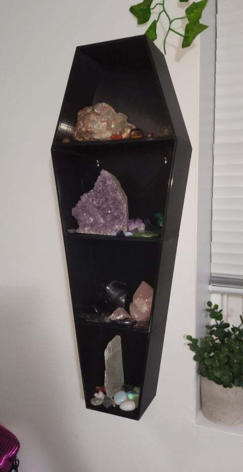 Tato nástěnná police ve tvaru rakve nabízí výrazné úložné řešení, které se ideálně hodí do domácnosti s gotickým nebo metalem inspirovaným interiérem. Díky tradičnímu designu rakve vytváří police na každé stěně jedinečný vizuální prvek. Je konstruována tak, aby byla robustní a stabilní, což umožňuje vystavit různé předměty, od krystalů a malých drobností až po knihy a dekorativní prvky, bez obav, že se police prohne pod tíhou.