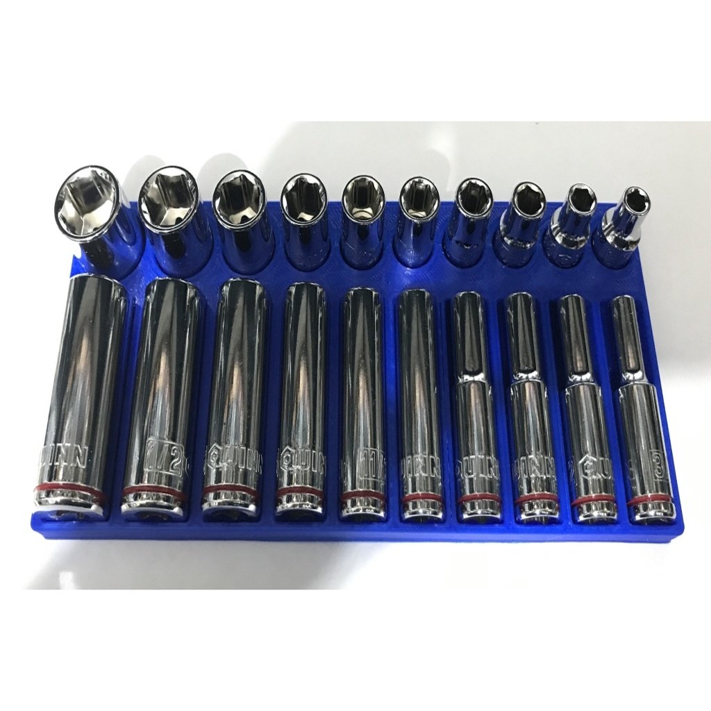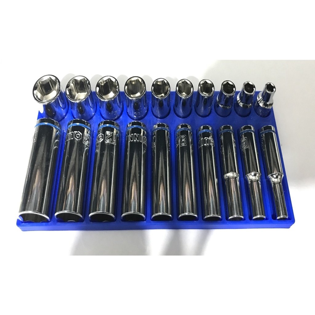 Metrická verze je kompatibilní s nástrčnými klíči od 5 mm do 14 mm a verze SAE se hodí pro velikosti od 3/16" do 9/16". Vytvořením přehledného přehledu o vašich nástrčných klíčích můžete optimalizovat svůj pracovní postup a vyhnout se zbytečnému hledání správného nástroje, což je výhodné při úkolech, které vyžadují rychlý přístup k různým nástrčným klíčům, například při použití šroubováku.
