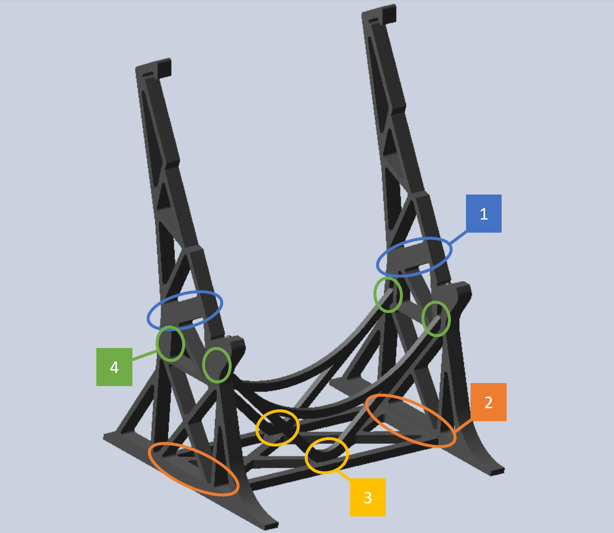 Podle obrázku níže připevněte tvary háčků (modré kroužky) k Falconu a zacvakněte stojan na dno pomocí malých zarážek na stupních stojanu (oranžový kroužek).