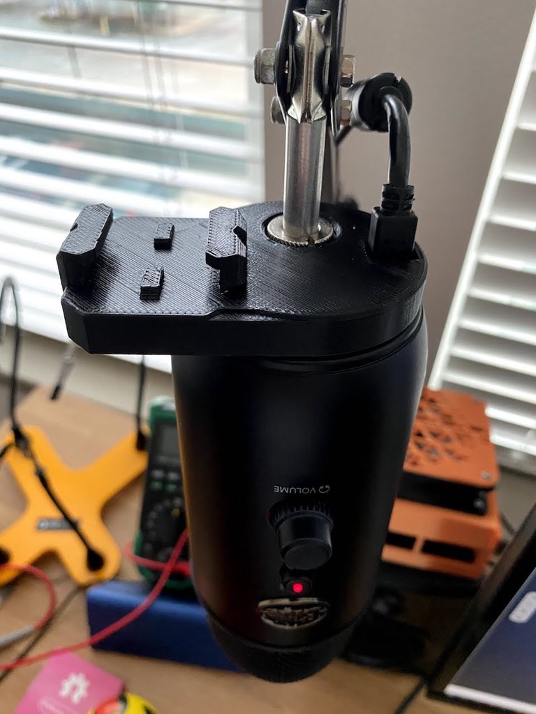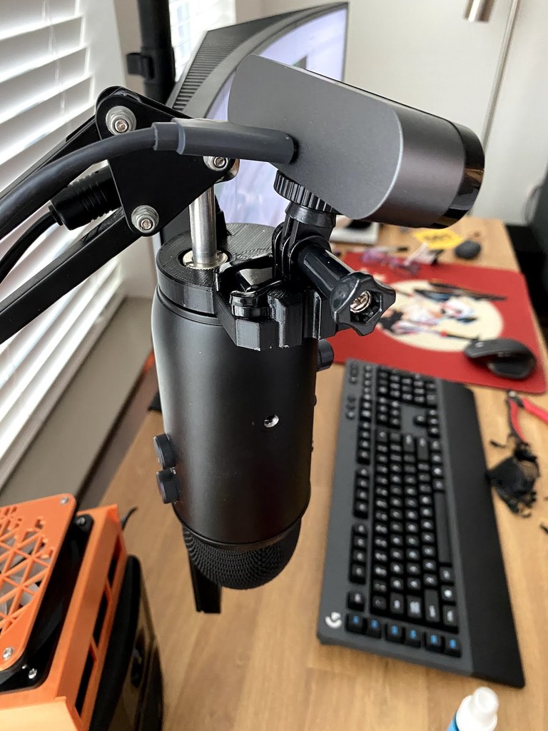 Jedná se o držák pro mikrofon Blue Yeti, který umožňuje montáž kamery GoPro nebo webové kamery na horní část mikrofonu (nebo vlastně pod něj). Ideální řešení pro ty, kteří mají vertikální sestavu s naskládanou obrazovkou, protože udržuje webovou kameru ve vyvýšené poloze a směřuje k uživateli ze strany.