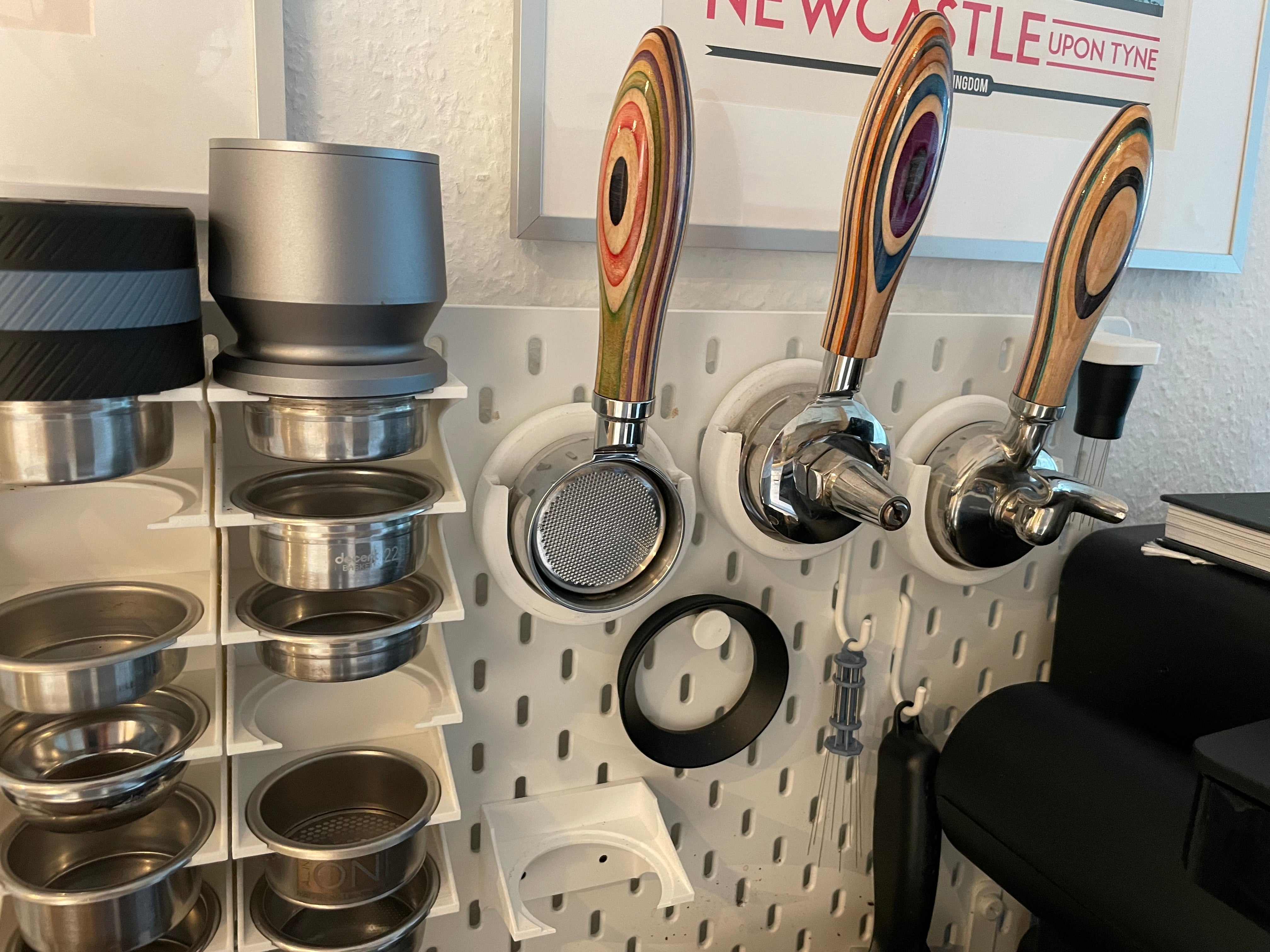 Tento praktický 58mm držák portafiltru je speciálně navržen tak, aby optimalizoval vaše espresso s vybavením Decent Espresso. Byl vytvořen tak, aby perfektně seděl na váš systém IKEA Skadis, což poskytuje organizované a snadno dostupné úložné řešení pro vaše portafiltry. Držák je pečlivě upraven tak, aby pojal portafiltry o šířce až 82,4 mm, což zajišťuje ideální uložení různých portafiltrů Decent Espresso, včetně standardních, čajových a bezdnových variant. Instalace je přímočará, protože znovu používá známý „Skadis Universal Hook“. S tímto držákem portafiltru můžete udržovat vaše espresso příslušenství uspořádané a váš pracovní prostor přehledný.
