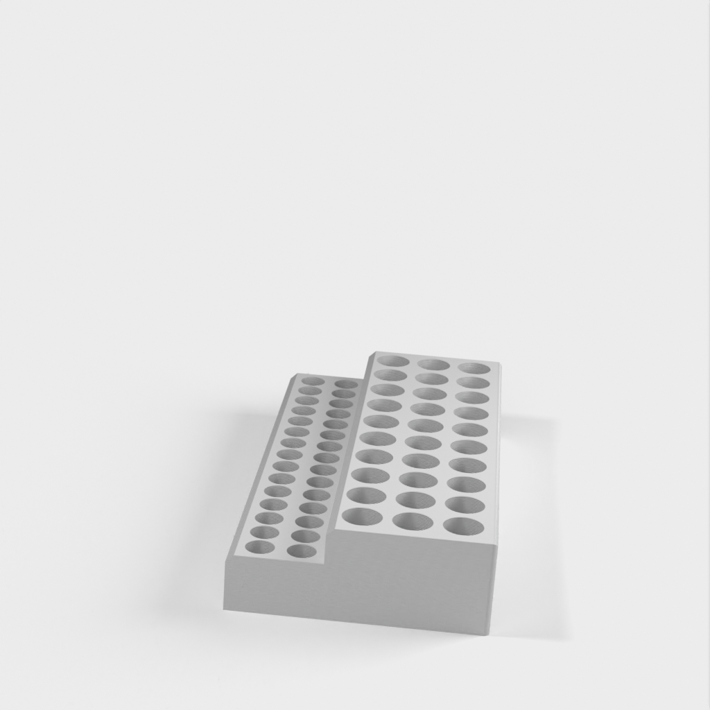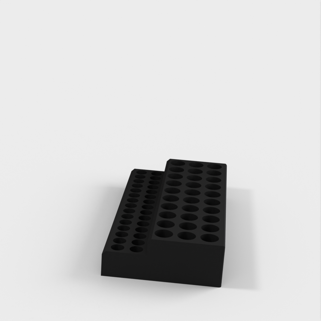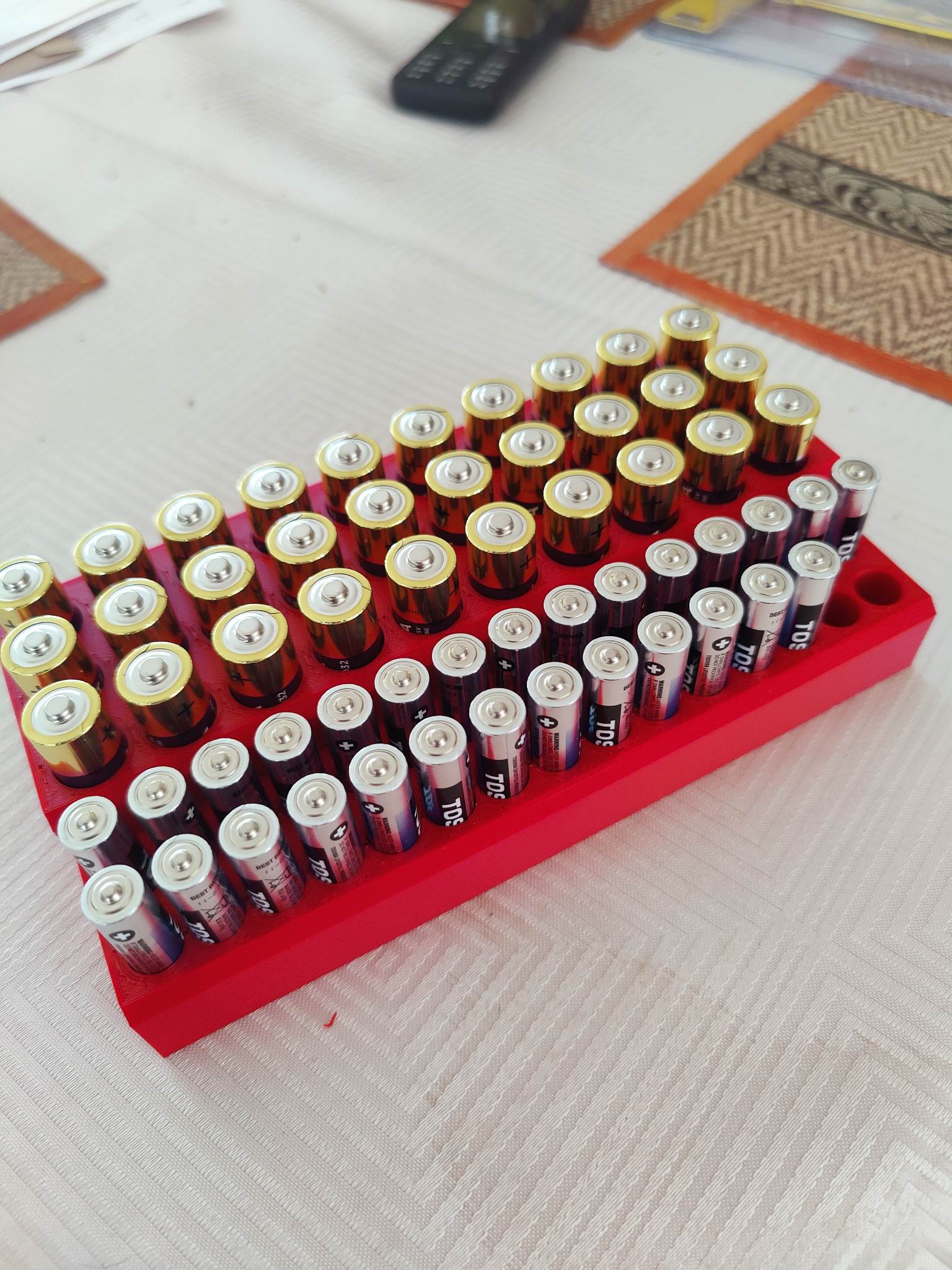 Jedná se o držák baterií určený pro efektivní a organizované skladování baterií. Při nákupu baterií jsou často dodávány v neforemných plastových nádobách, takže je obtížné baterie vyjmout. S tímto držákem baterií můžete mít až 60 baterií pohromadě na jednom místě. Je úhledný, kompaktní a snadno se ukládá do zásuvky pracovního stolu.