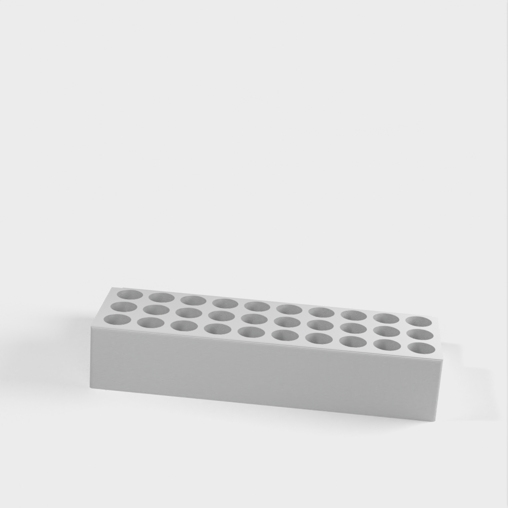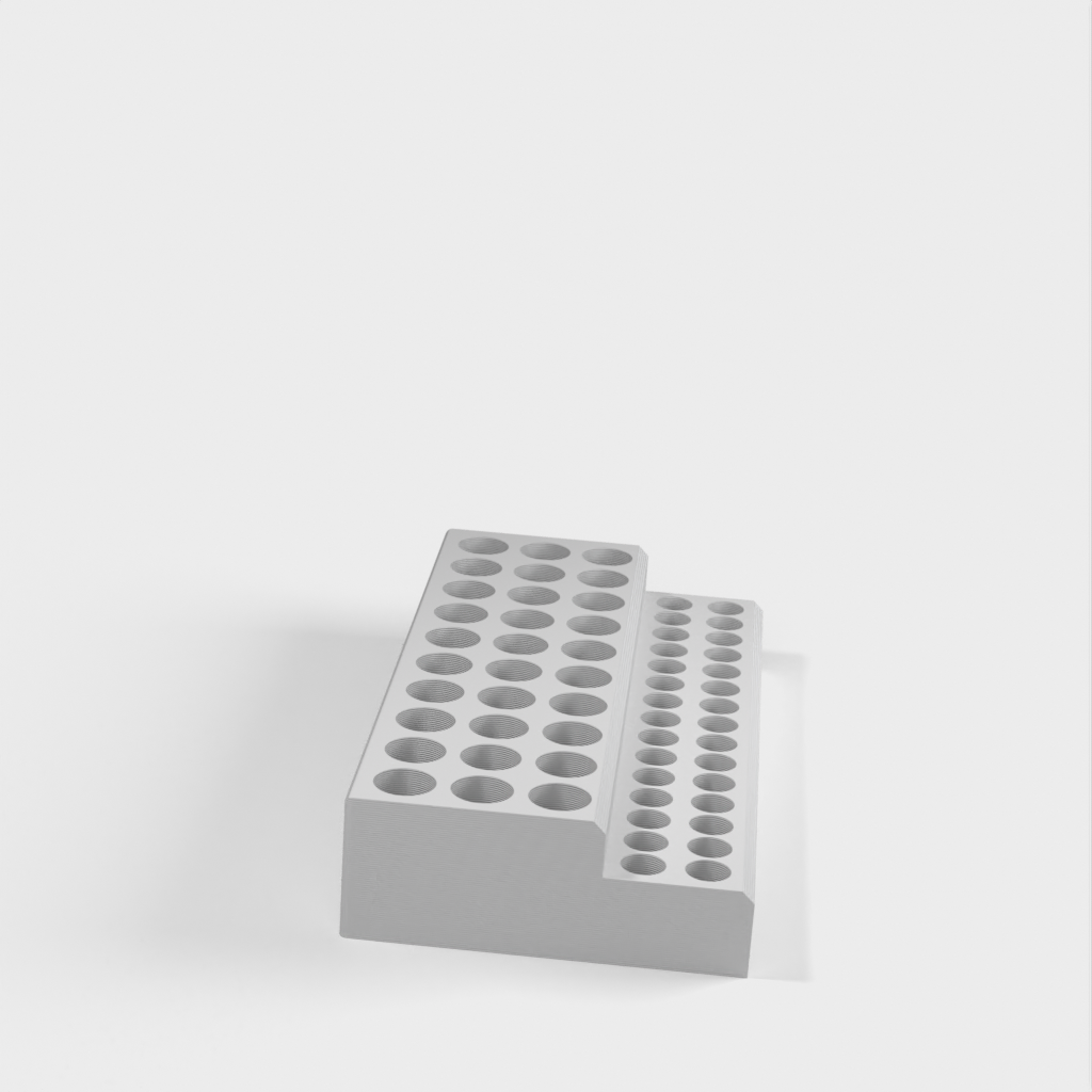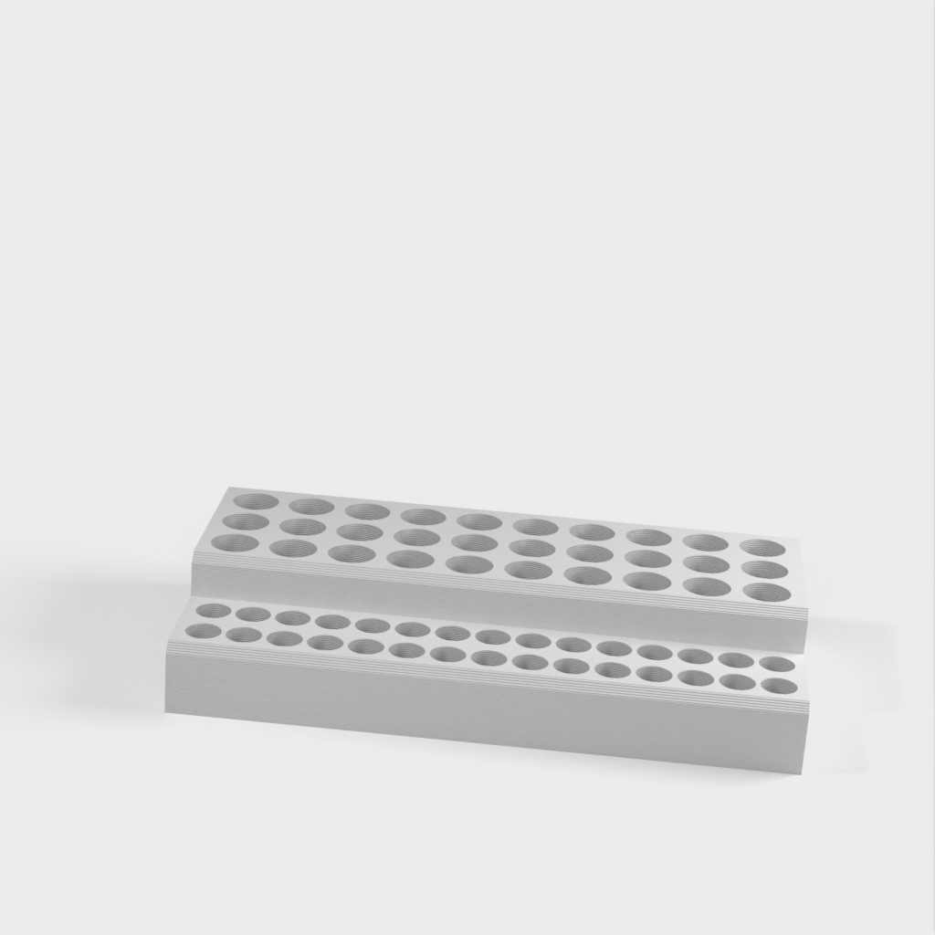 Jedná se o držák baterií určený pro efektivní a organizované skladování baterií. Při nákupu baterií jsou často dodávány v neforemných plastových nádobách, takže je obtížné baterie vyjmout. S tímto držákem baterií můžete mít až 60 baterií pohromadě na jednom místě. Je úhledný, kompaktní a snadno se ukládá do zásuvky pracovního stolu.