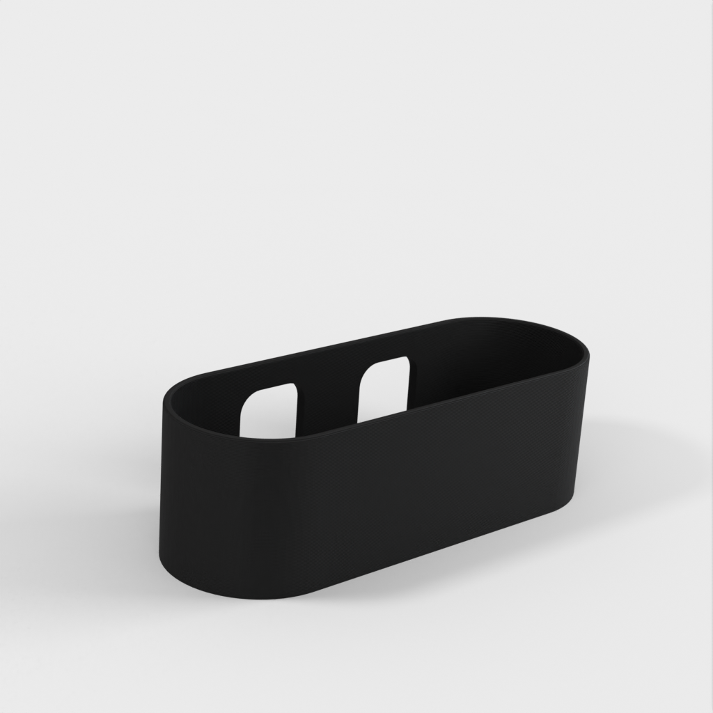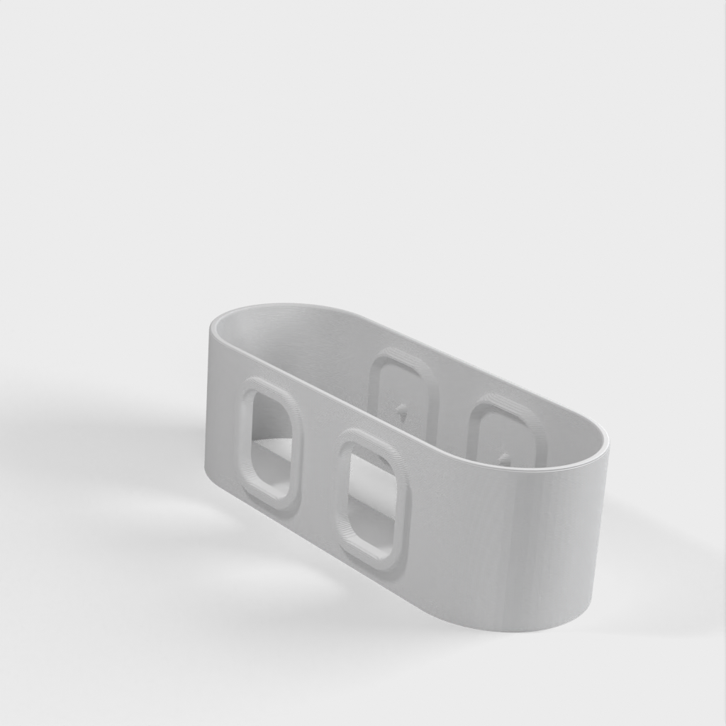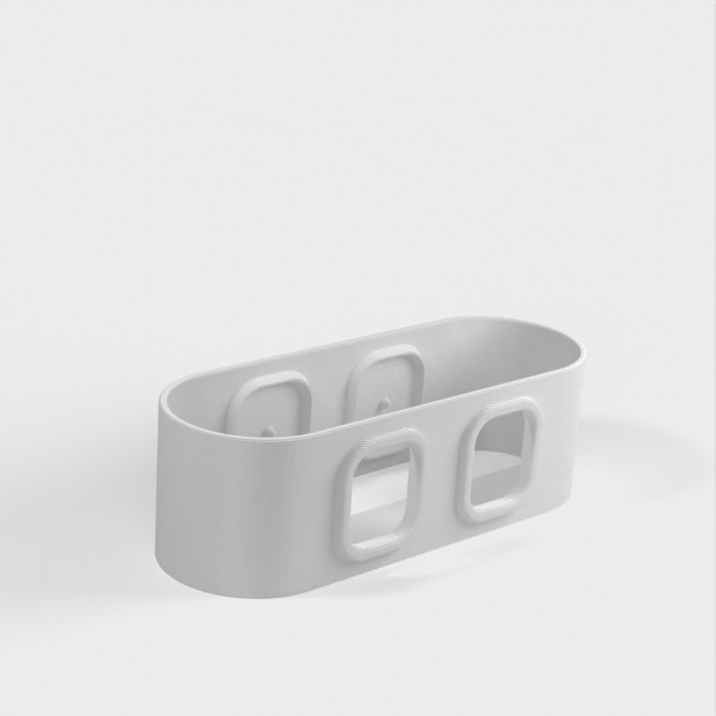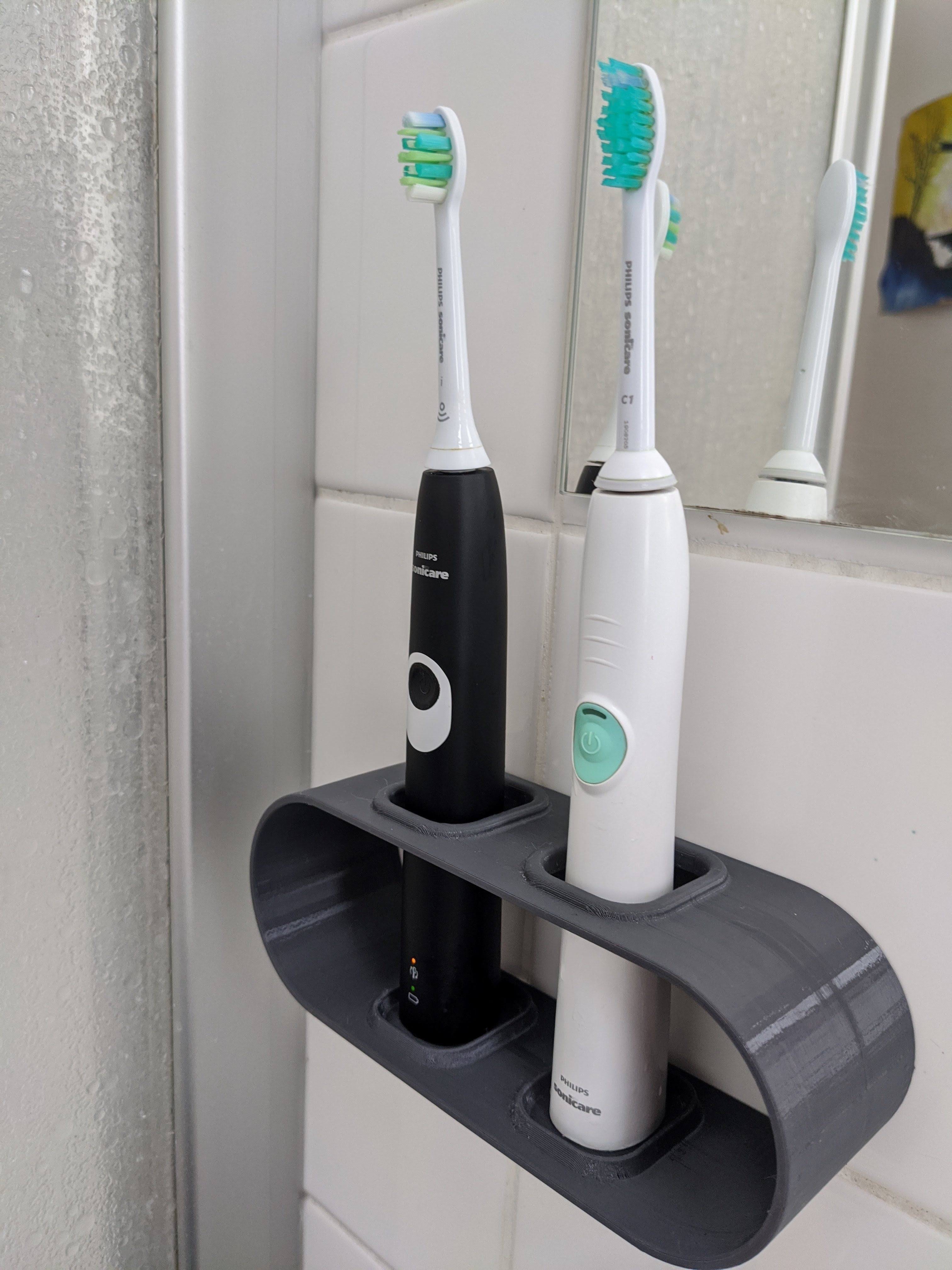 Držák elektrického zubního kartáčku určený pro dva zubní kartáčky (Philips Sonicare). Tento držák lze snadno připevnit na jakýkoli povrch pomocí oboustranné montážní pásky. Jednoduché a praktické řešení, jak mít elektrické zubní kartáčky uspořádané a snadno dostupné.