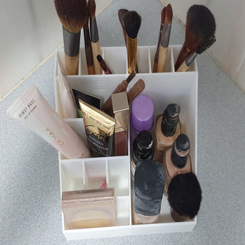 Praktický držák na make-up s přepážkami, díky kterým je snadné uspořádat štětce a další make-up vybavení. Tento držák vám pomůže udržet váš stůl nebo koupelnovou skříňku úhlednou a uklizenou a zároveň budete mít své produkty vždy na dosah. Perfektní doplněk do vaší domácnosti!