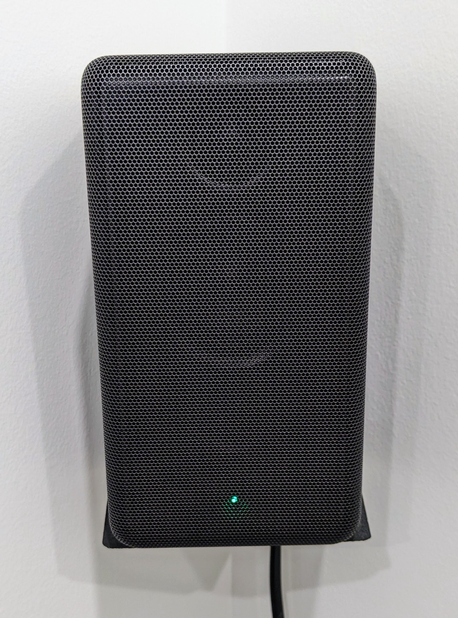 Držák se bezpečně připevní na zeď pomocí dvou šroubů a pro větší stabilitu se doporučuje použít nástěnné kotvy. Reproduktor sedí v držáku pevně a bezpečně díky specifickým výřezům pro nožičky reproduktoru a uzamykacímu mechanismu, který zabraňuje jeho naklonění dopředu, a to i při nešťastném šťouchnutí.