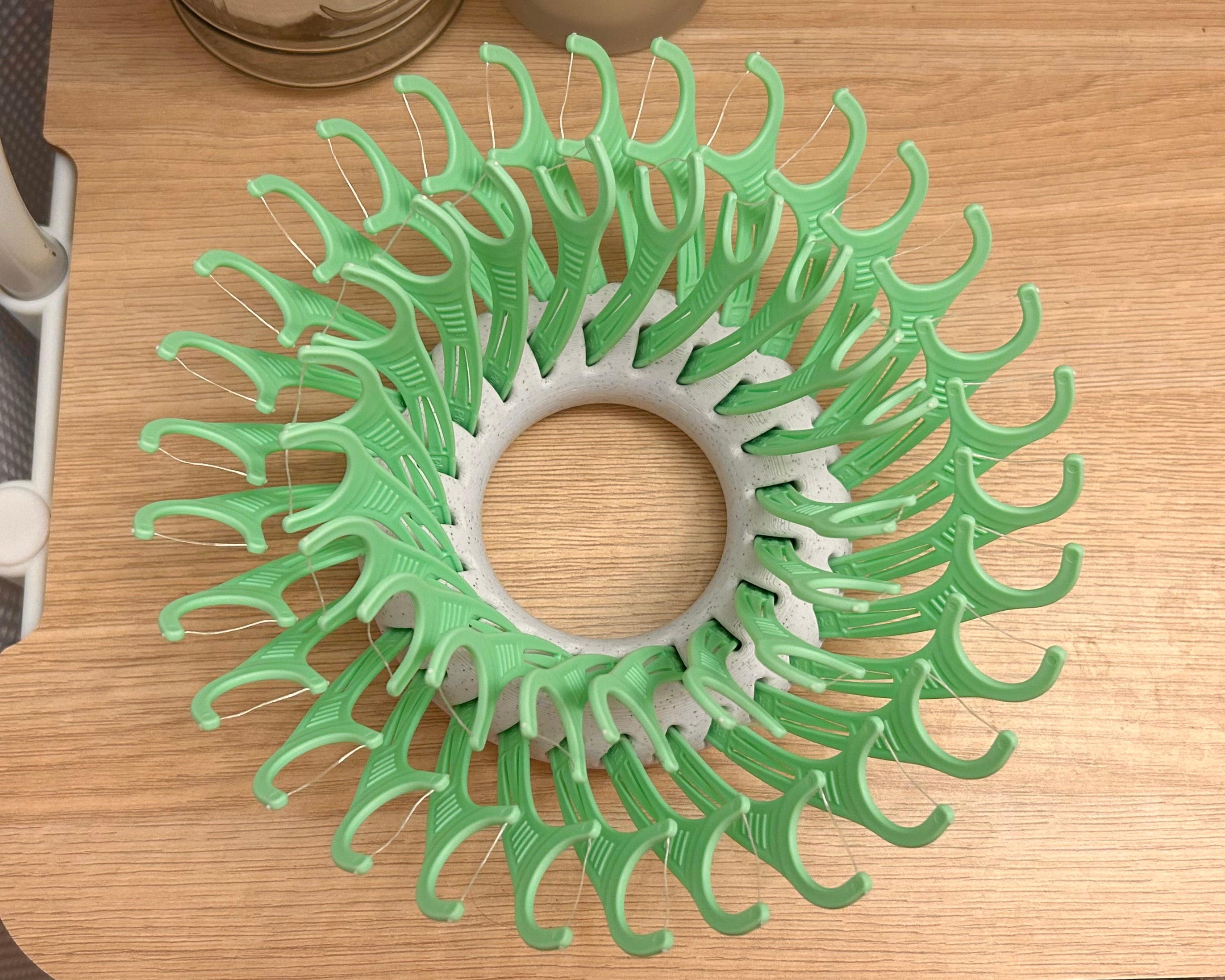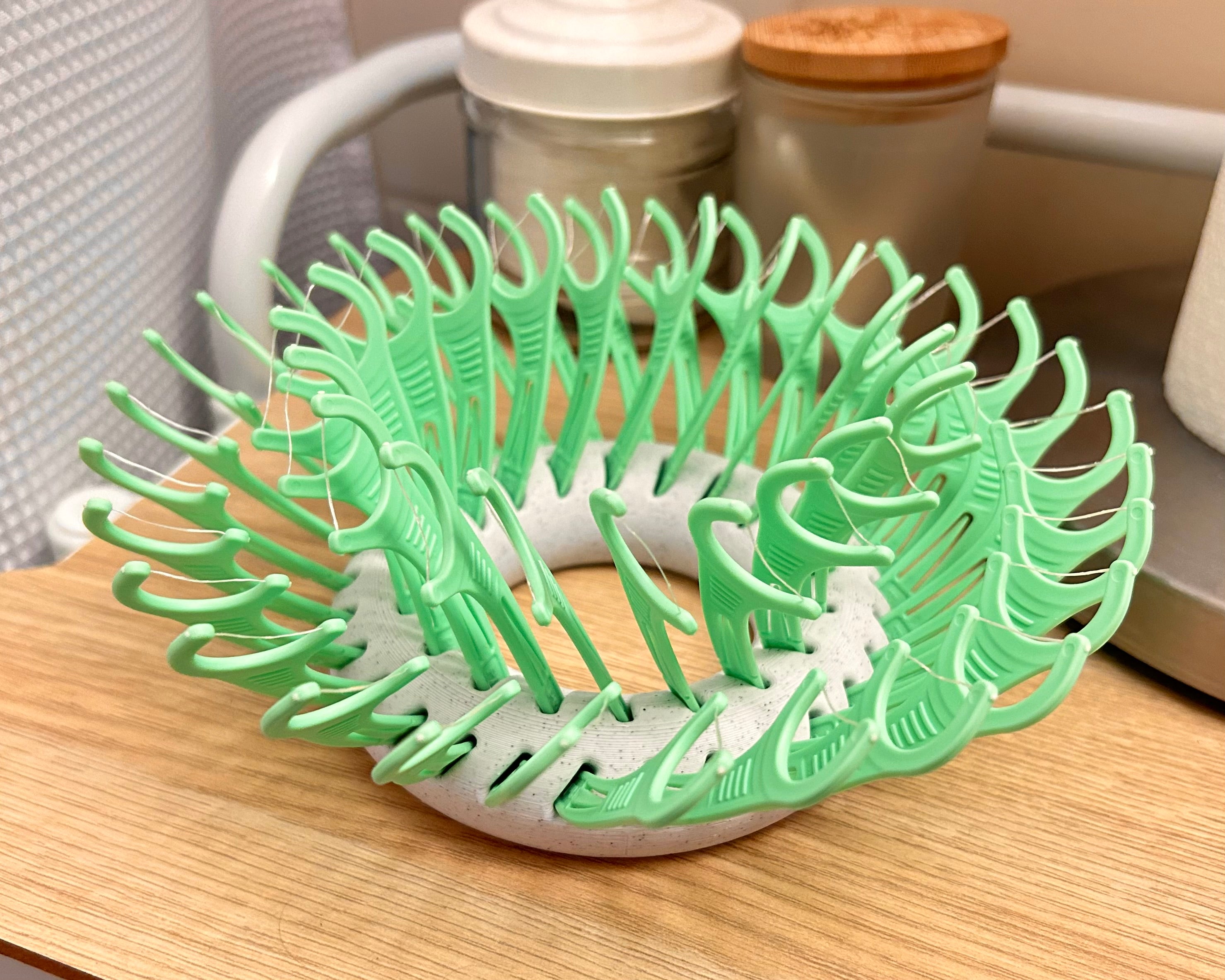 Placker Ring - Držák na nitě je užitečné řešení pro uskladnění vašich zařízení na zubní nit. Tento chytrý organizační systém pojme až 50 Placker nití ve snadno dostupných přihrádkách. Je navržen tak, aby udržel vaši koupelnu uklizenou a efektivní, takže máte své produkty pro péči o zuby vždy po ruce. S stabilním designem, který nevyžaduje podpěrné materiály během tisku, je tento držák na nitě praktickým doplňkem do každé koupelny.
