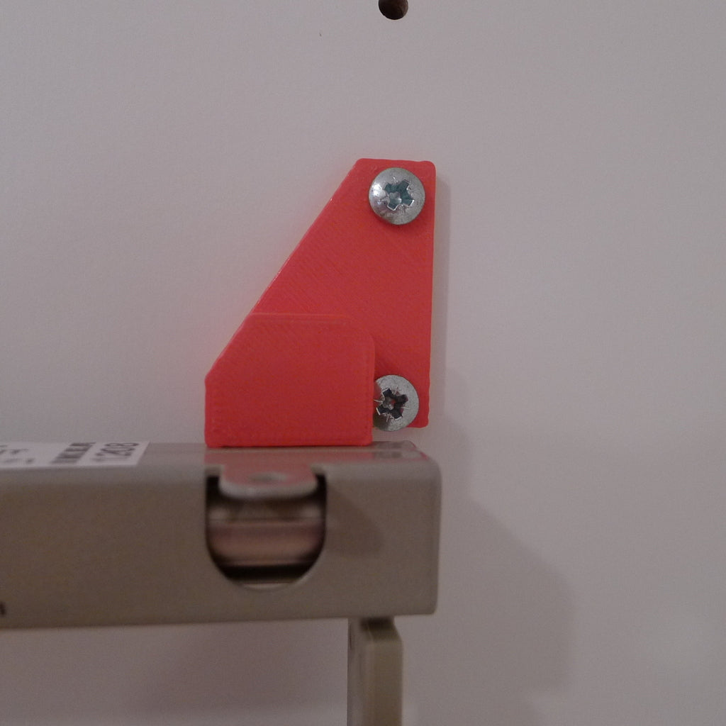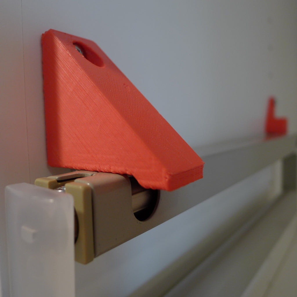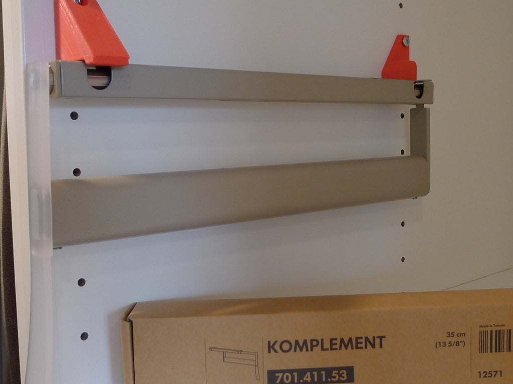 Držáky pro výsuvný věšák na oblečení IKEA PAX KOMPLEMENT. Tyto držáky jsou navrženy tak, aby přizpůsobily kolejnici KOMPLEMENT 32mm policovým čepům na skříni. Používají se k montáži kolejniček na stranu skříně spíše než na dno police. To poskytuje praktičtější způsob, jak organizovat oblečení ve vašem systému PAX.