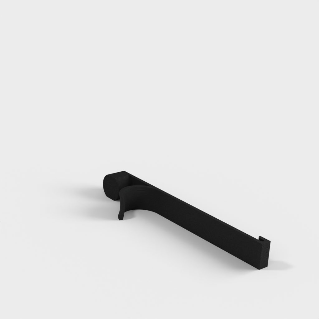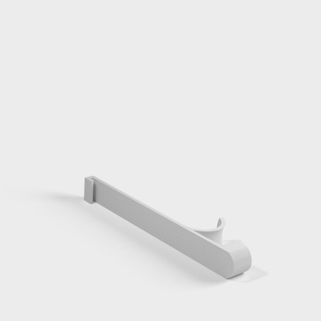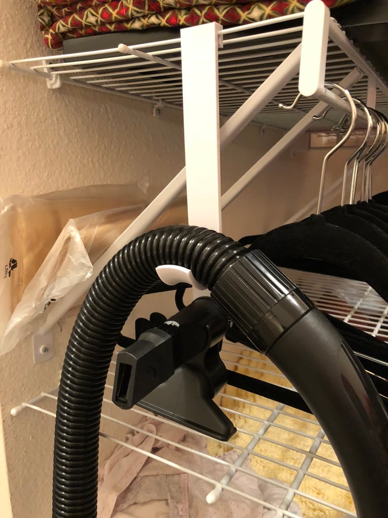 Držák na stěnu pro standardní hadici vysavače. Lze jej snadno zavěsit na drátěnou polici skříně o průměru 3 mm. Má také další úložný prostor pro příslušenství vysavače.