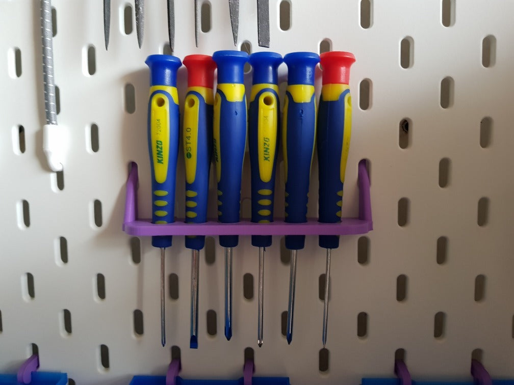 Šroubovací držák na nástěnnou desku IKEA Skadis (SKÅDIS), určený pro uchycení 6 menších šroubováků. Držák dokonale zapadá do organizačního systému vašeho Skadi a usnadňuje držení šroubováků na místě a v dosahu. Dobře navržený pro šroubováky s rukojetí menší než kovová část, tento držák má plný řez pro jejich zasunutí. Dodává se se 7 zásuvkami, i když pojme pouze 6 šroubováků najednou.
