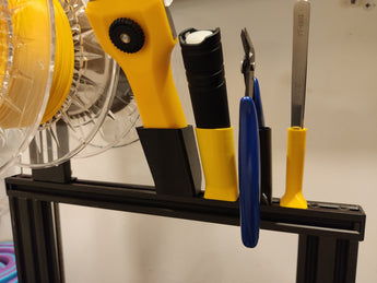 Každý držák se jednotlivě připevňuje k vytlačování pomocí jediné T-matice a šroubu M4, což zajišťuje stabilní a spolehlivou montáž. Tento systém pomáhá udržovat uklizenou a funkční pracovní stanici, kde jsou základní nástroje systematicky uspořádány a snadno k nalezení, což zlepšuje váš pracovní proces.