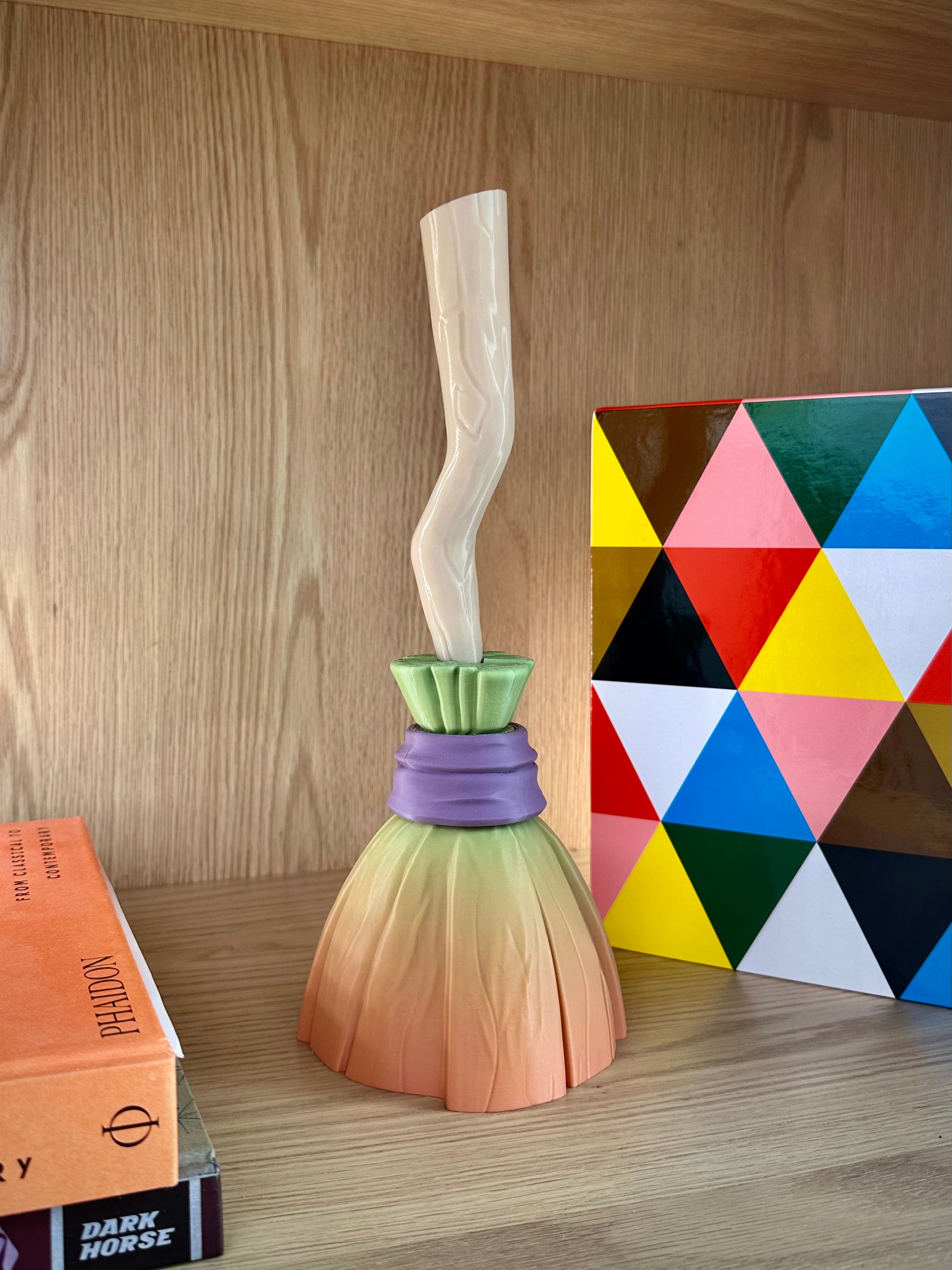 - Dekorativní design koštěte, který skrývá funkční pero.