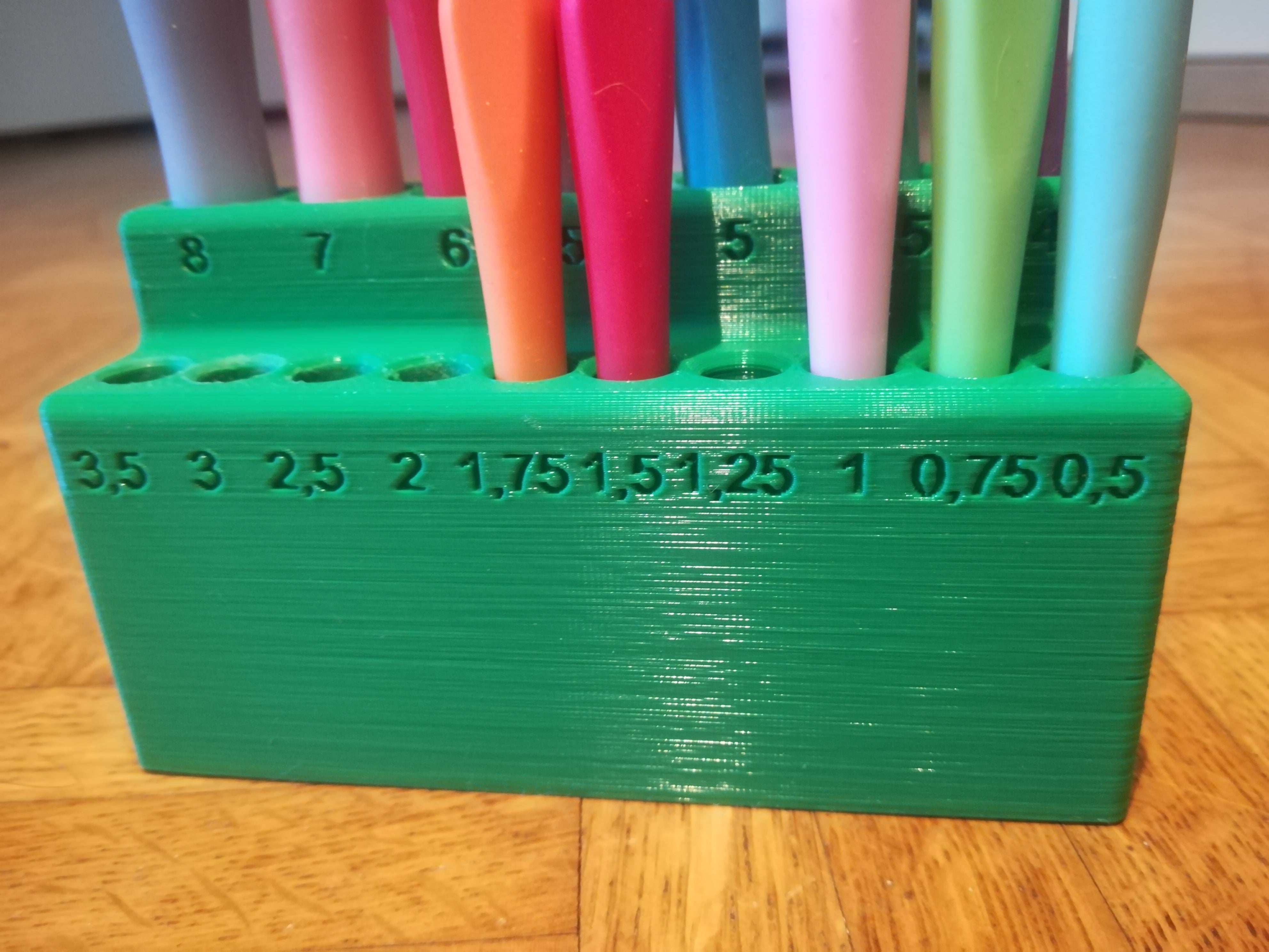 Tento držák je dokonalým řešením pro uložení vašich oblíbených háčkovacích jehel. Pojme 17 různých velikostí háčkovacích jehel, takže můžete snadno sledovat své nástroje a rychle najít správnou velikost pro svůj projekt. S velikostí otvorů od 12 mm do 8 mm se stojan přizpůsobí široké škále háčkovacích jehel, takže je budete mít vždy po ruce, když vás zasáhne inspirace.