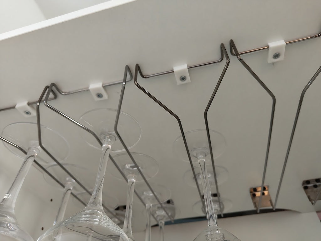 Jedná se o malý držák pro připevnění držáků na sklo IKEA Besta (304.119.53) na jakoukoli polici – v našem případě kuchyňskou skříňku IKEA Metod. Použitý šroub je Spax 3,5x20.