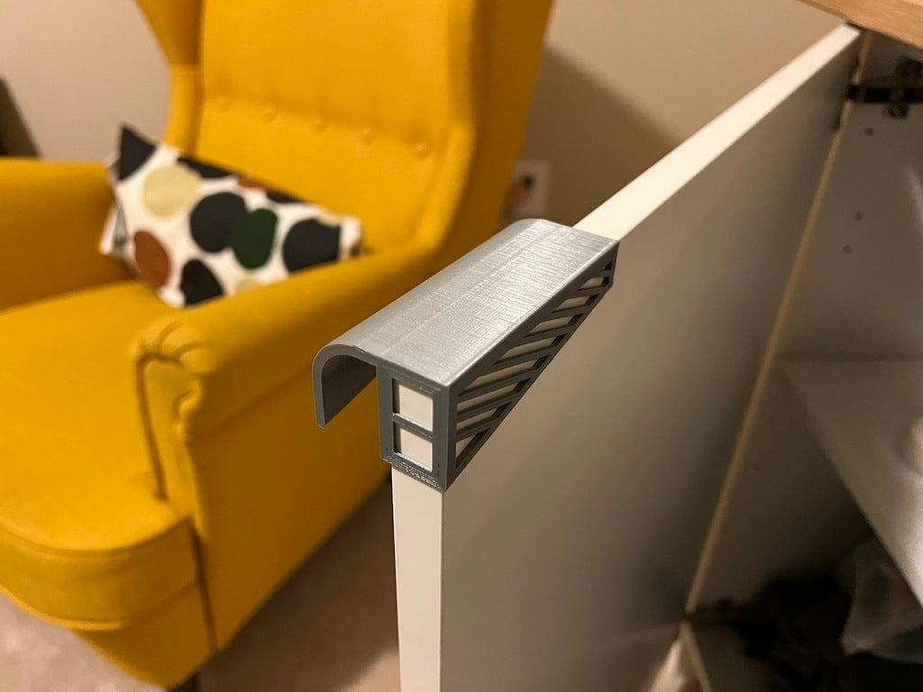 Tento produkt je úchytka skříňky, navržená tak, aby pasovala na dvířka skříněk Ikea KNOXHULT o tloušťce 16,4 mm. Úchytky nevyžadují žádné vrtání ani otvory, protože jsou navrženy tak, aby těsně přiléhaly k dvířkům skříněk pomocí tření. Pokud chcete těsnější uchycení, můžete použít oboustrannou pásku nebo vložit kus silného papíru. Můžete „vyměnit“ stranu a použít je svisle místo vodorovně.