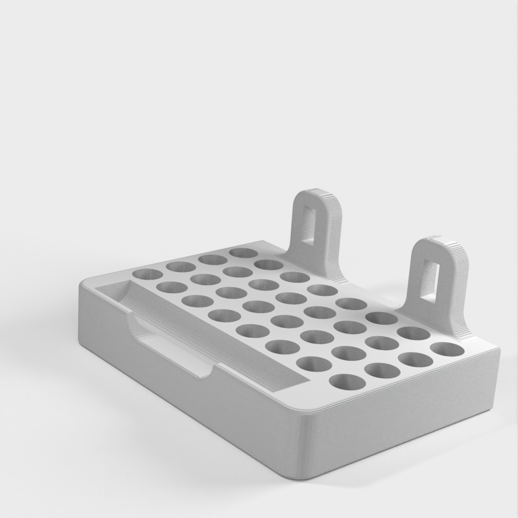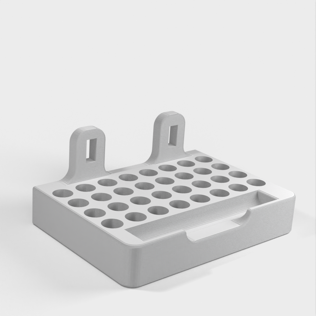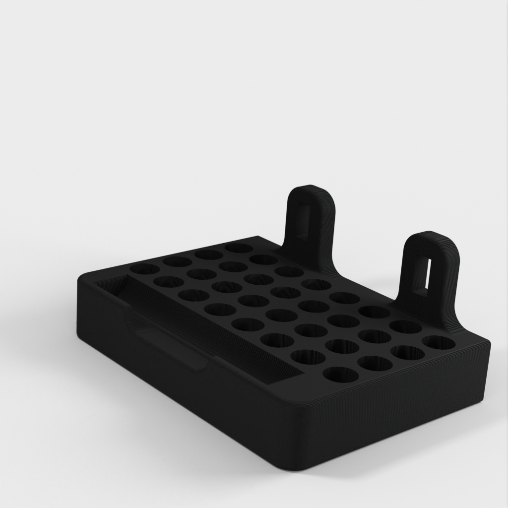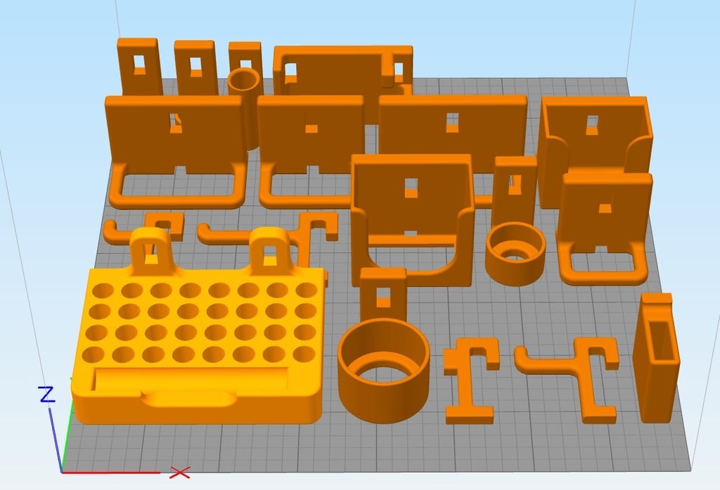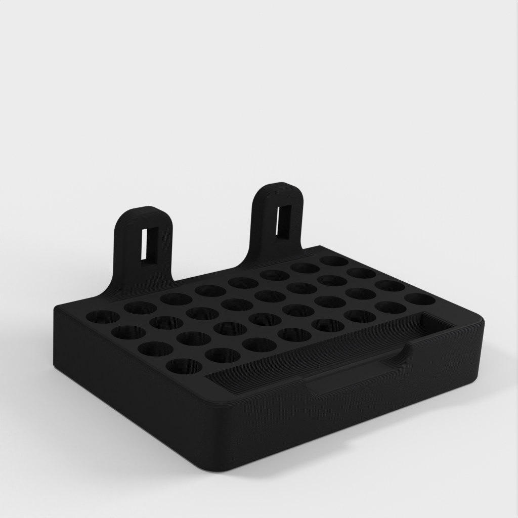Toto je moje kolekce háčků Ikea Skådis, inspirovaná kolekcí CSD Salzburg. Jsou zde obsaženy držáky na různé nástroje, jako jsou vrtáky, skládací metry, šestihranné klíče, kleště, šroubováky, Bosch Zamo, tužka a skalpel. Součástí je také univerzální háček pro všechny držáky a háčky tří různých délek. Držáky jsou kompatibilní s univerzálními háky CSD Salzburg.