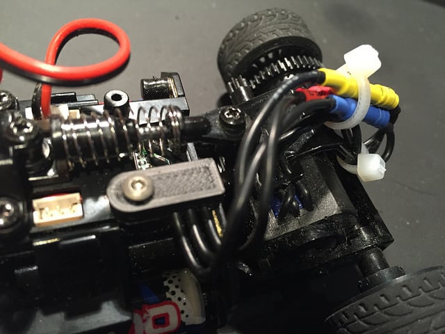 Tato kabelová svorka pro Kyosho Mini-Z MR-03 je navržena pro zlepšení životnosti motorových kabelů vašeho dálkově ovládaného vozu. Původně jsou motorové kabely na řídicí desce MR-03VE vystaveny značnému pohybu, což často vede k ohýbání tenkých vodičů a jejich potenciálnímu zlomení u desky plošných spojů. To může vést k potřebě časově náročné demontáže a oprav.