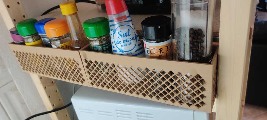 Uspořádejte si koření s tímto praktickým držákem na koření, navrženým speciálně pro oblíbený policový systém IVAR 50 cm od IKEA. Toto chytré úložné řešení vám umožní efektivně uspořádat sklenice s kořením, takže je budete mít vždy po ruce, když budete vařit. Držák je konstruován tak, aby dokonale pasoval pod vodorovnou polici, což zajišťuje optimální stabilitu a využití prostoru. Robustní spodní podpěra dále přispívá k odolnosti a dodává vaší poličce na koření extra odolnost. Pro bezpečné upevnění je zapotřebí 5 vrutů do dřeva pro samotný držák a dalších 3 vruty pro spodní podpěru. Kromě toho jsou dva hlavní díly spojeny jedním šroubem M3. Pro pevnou montáž doporučujeme použít vruty do dřeva M3 x 15 mm. Vytvořte si organizovanější a funkčnější kuchyni s tímto elegantním úložištěm na koření.