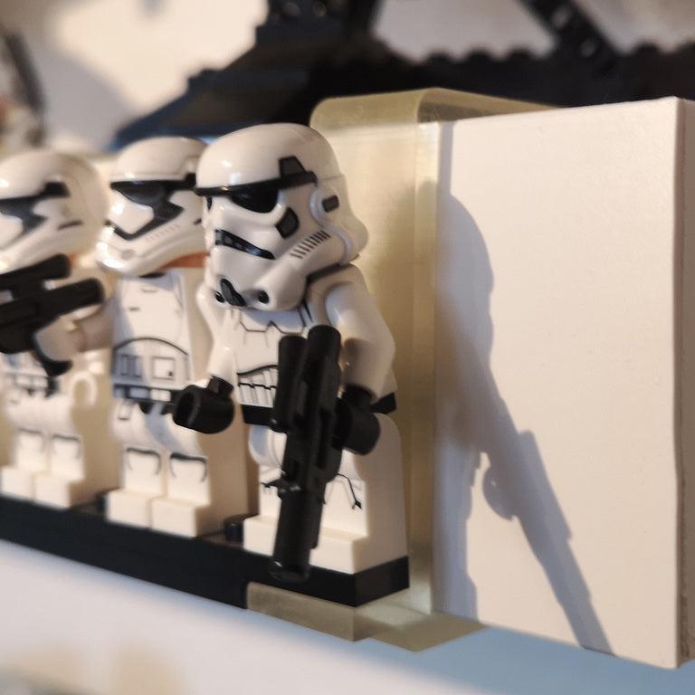 Držák na poličku pro minifigurky LEGO, který se hodí na poličku o velikosti 50 mm. Ideální pro stylové uspořádání a vystavení sady LEGO Mini Figures