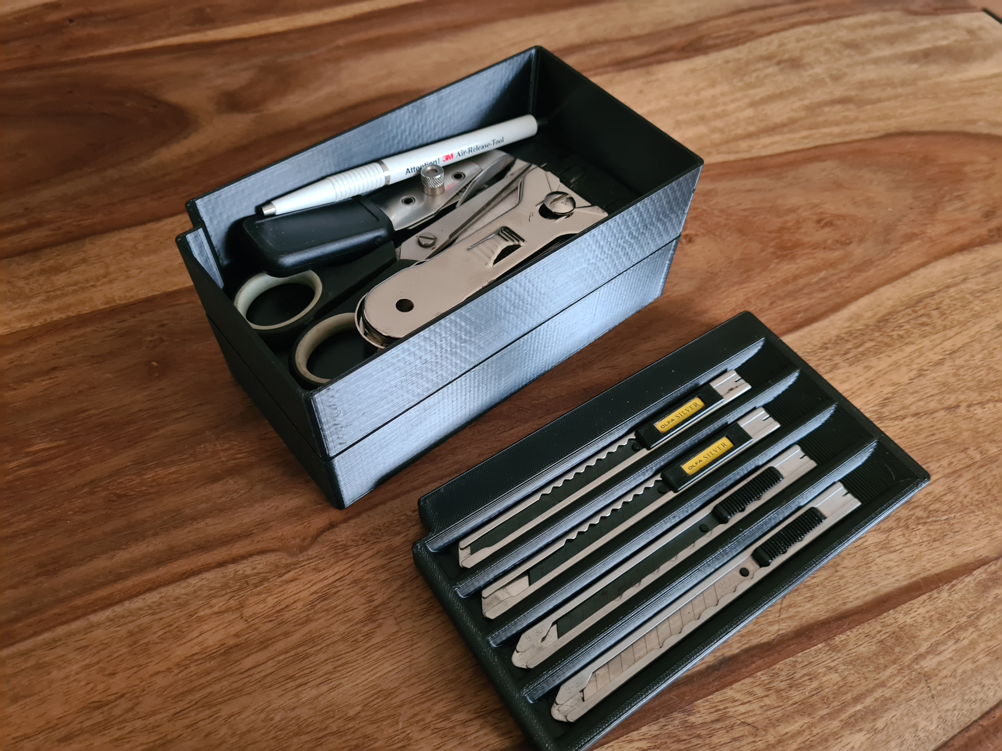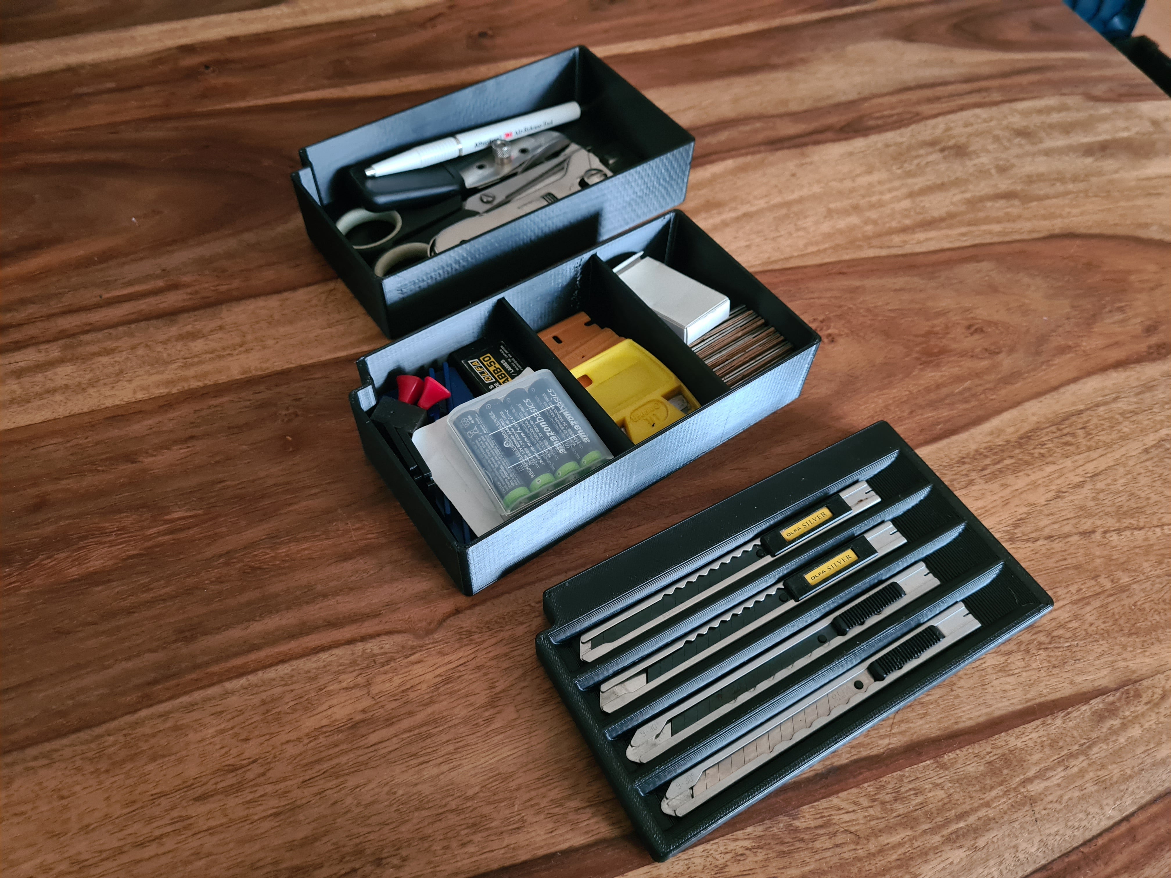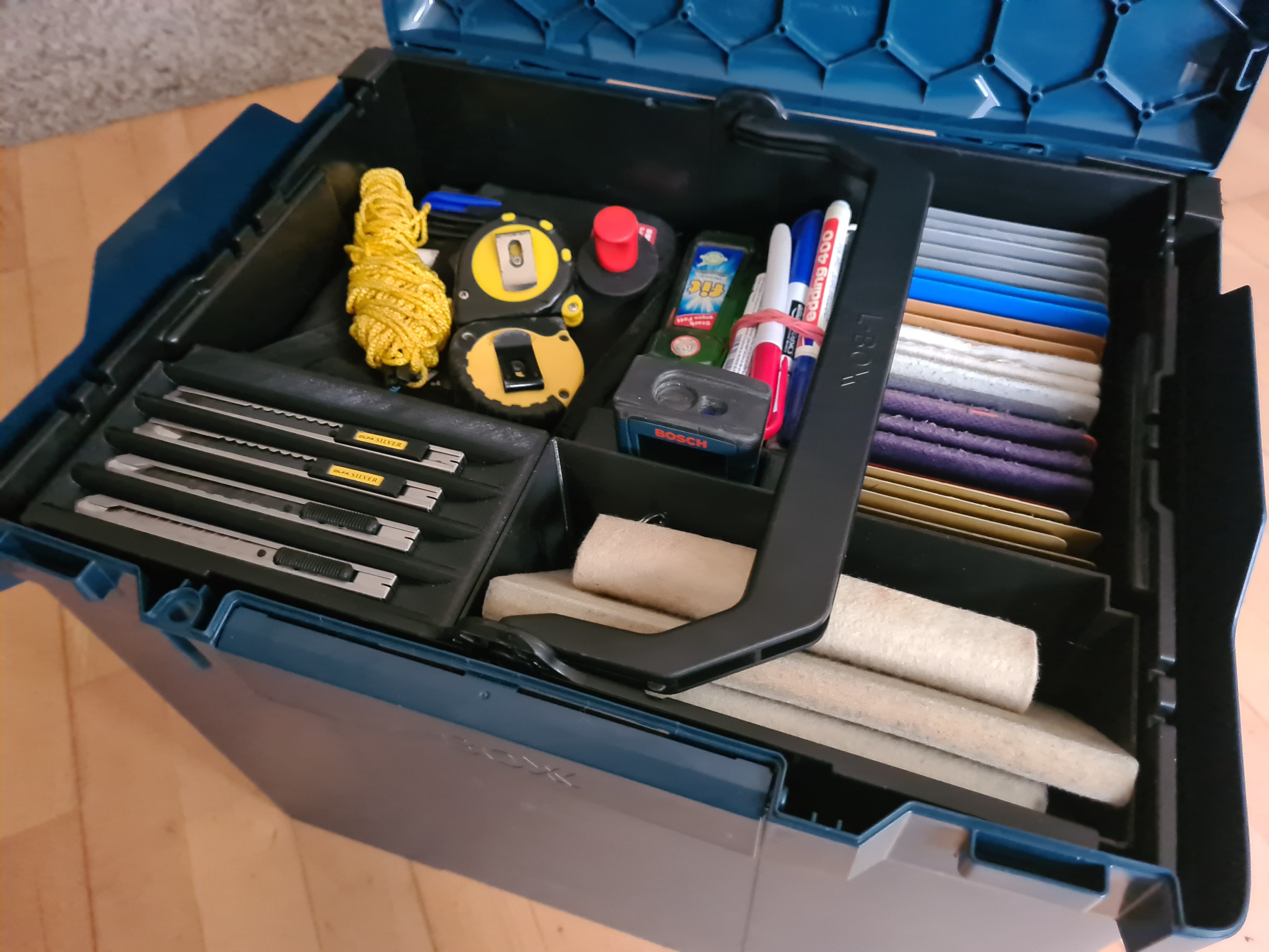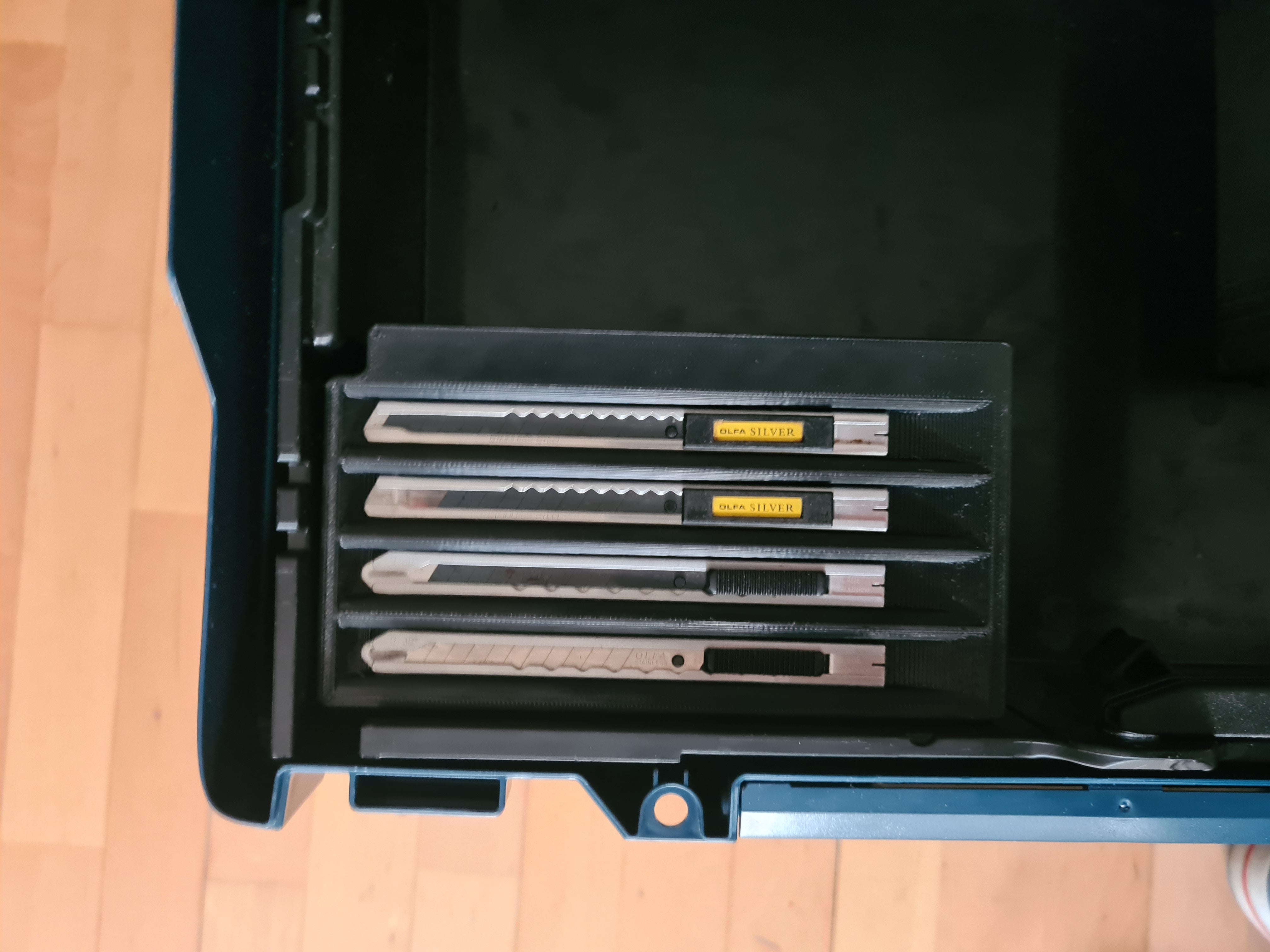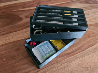 Box je rozdělen do praktických přihrádek, z nichž jedna je věnována vašemu řezacímu noži pro rychlý a bezpečný přístup. Kromě toho obsahuje dvě další úložné prostory, které jsou ideální pro uspořádání náhradních nožů, břitev, malých baterií nebo jiných podobných spotřebních materiálů. Spodní modulární boxy mohou obsahovat další speciální nástroje, což přispívá k uklizenému a efektivnímu pracovnímu prostoru.