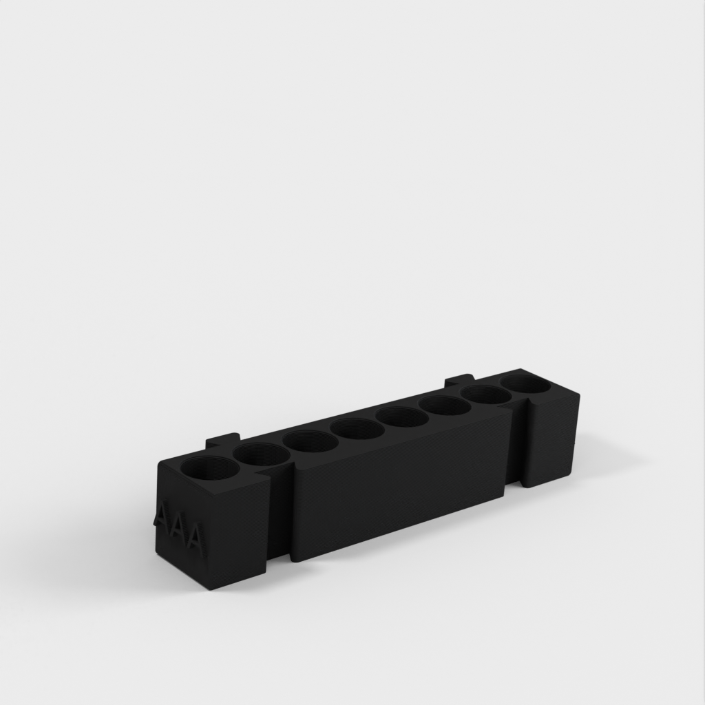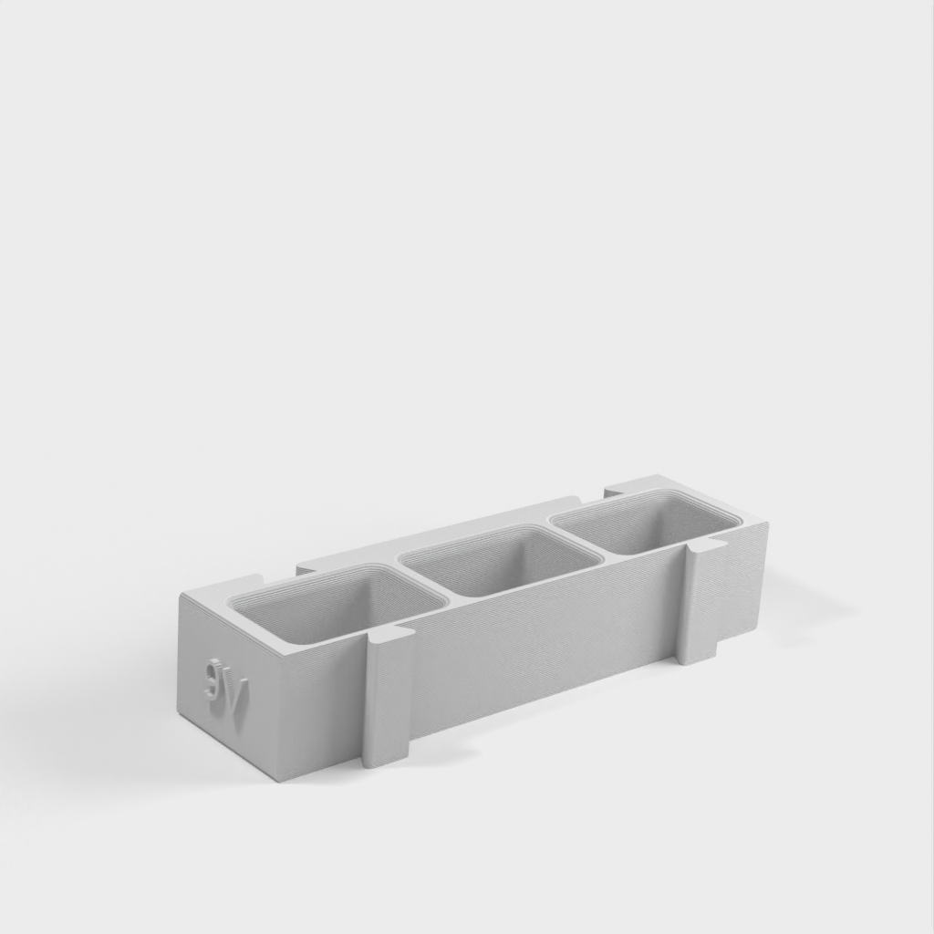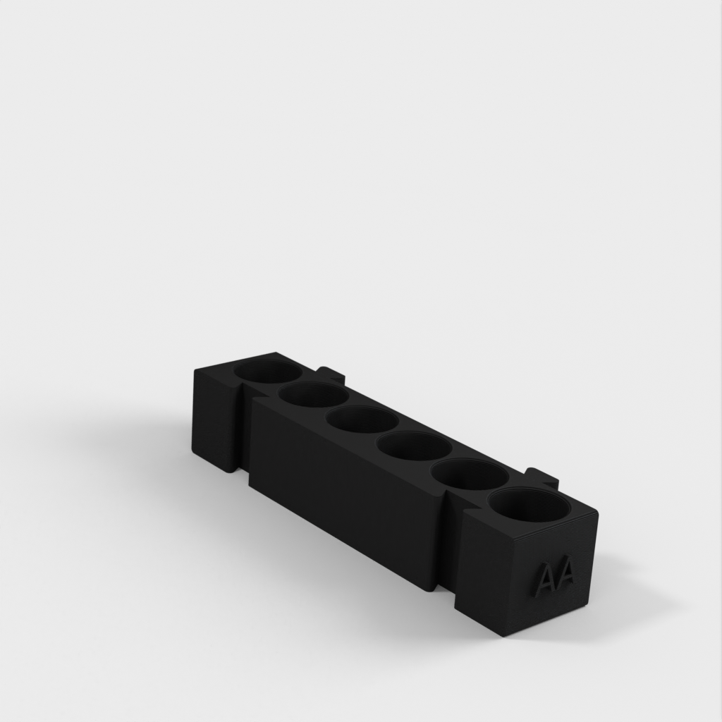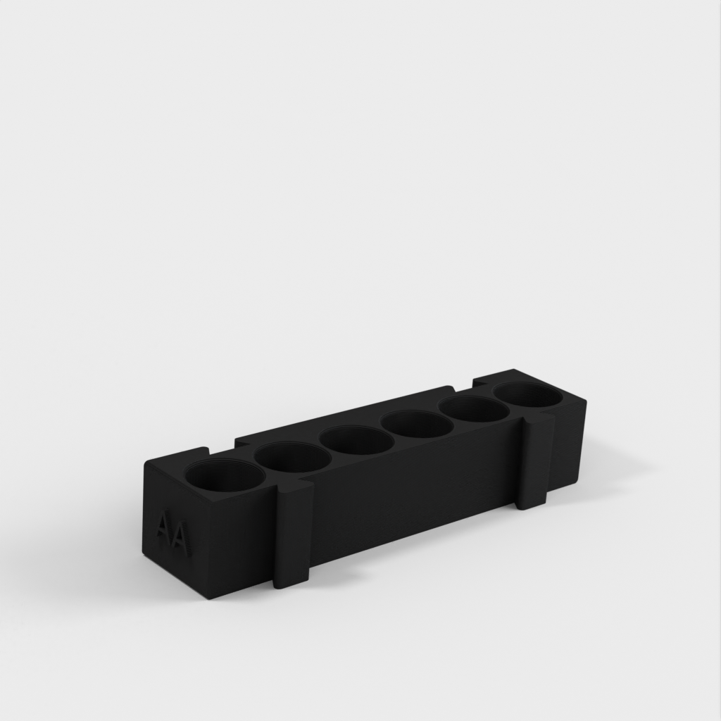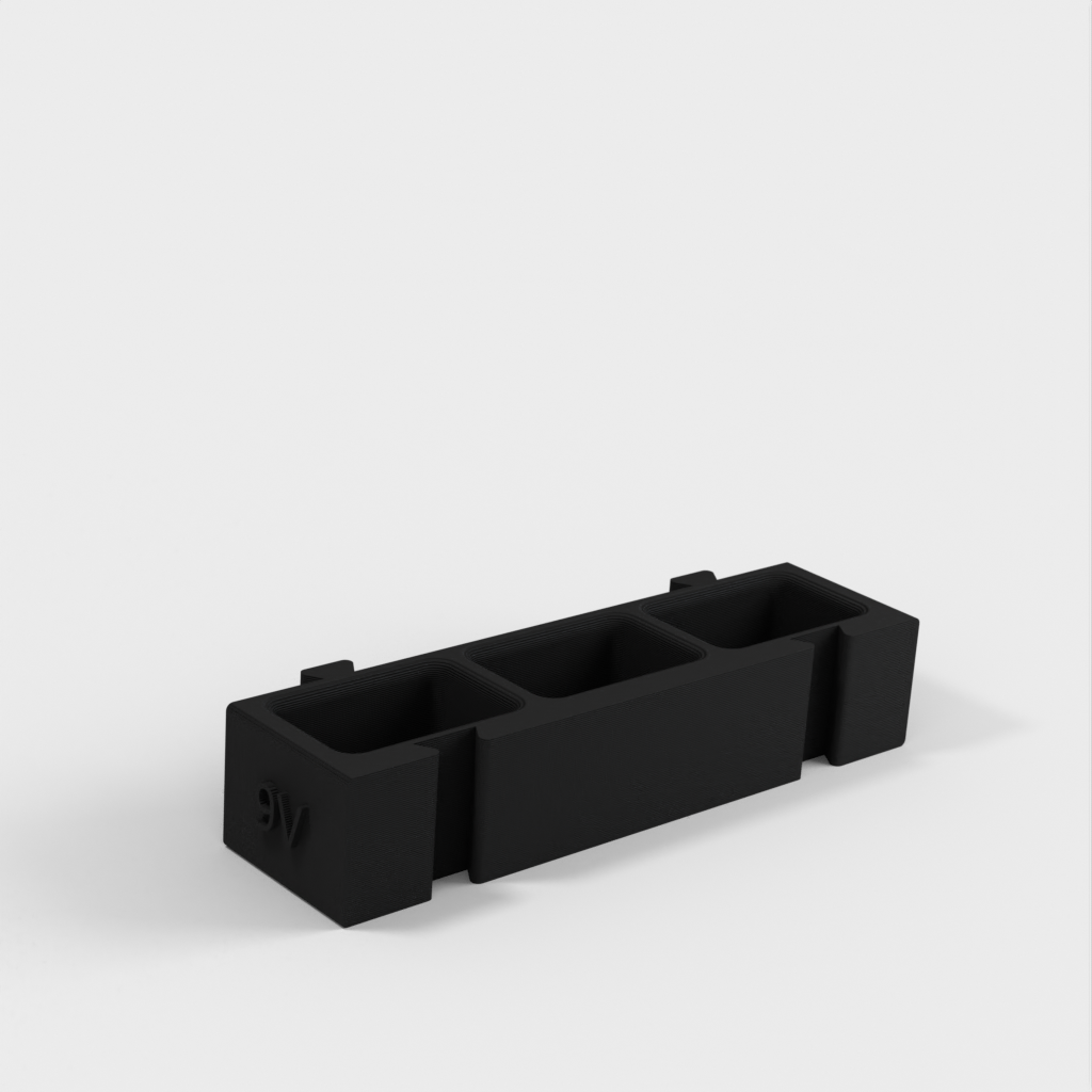 Jedná se o modulární držák baterií, který nabízí různé držáky pro jednotlivé typy baterií. Všechny držáky mají stejnou délku a lze je k sobě připnout v libovolné kombinaci. Je to ideální řešení, jak si uspořádat stůl a mít přehled o bateriích. Přidáním držáku na baterie AA a držáku na mince do sbírky se jeho funkčnost ještě zvýší.