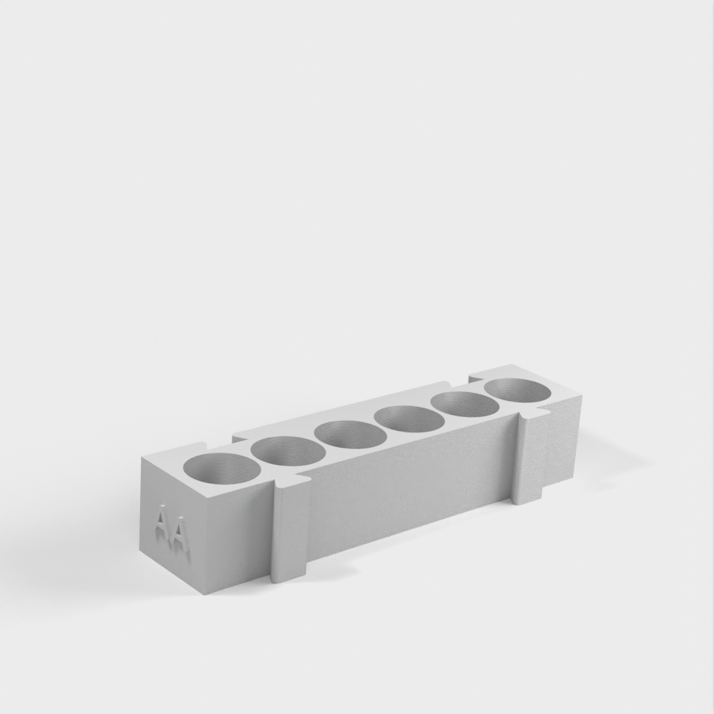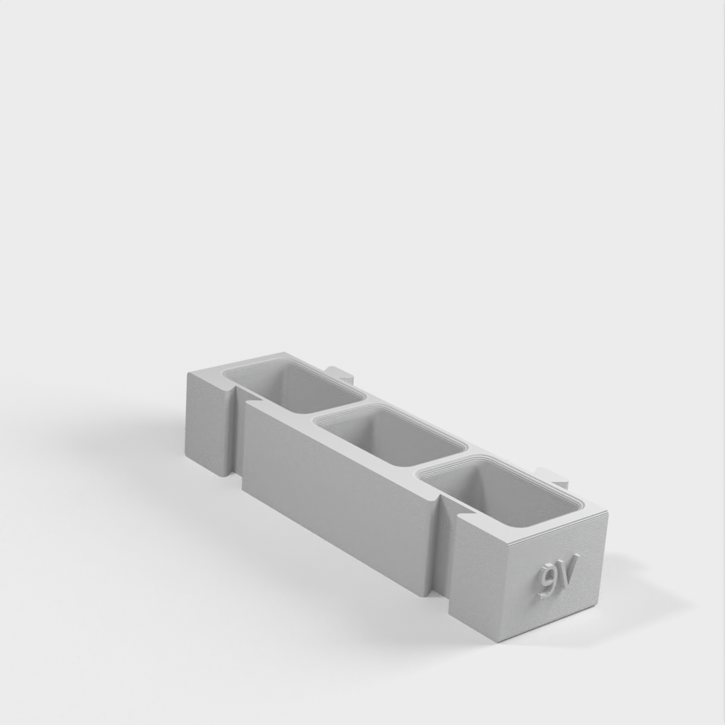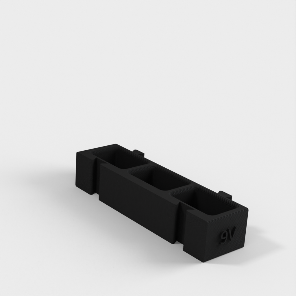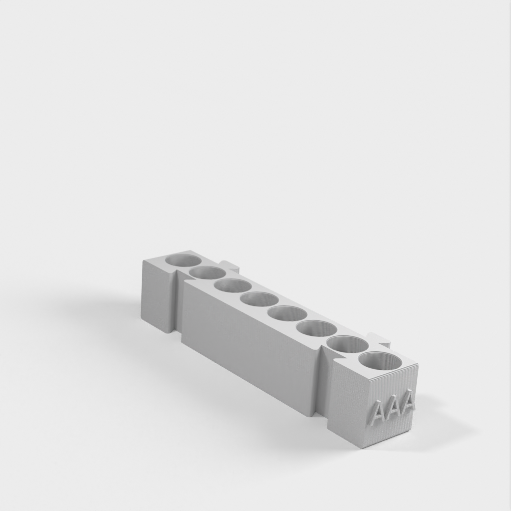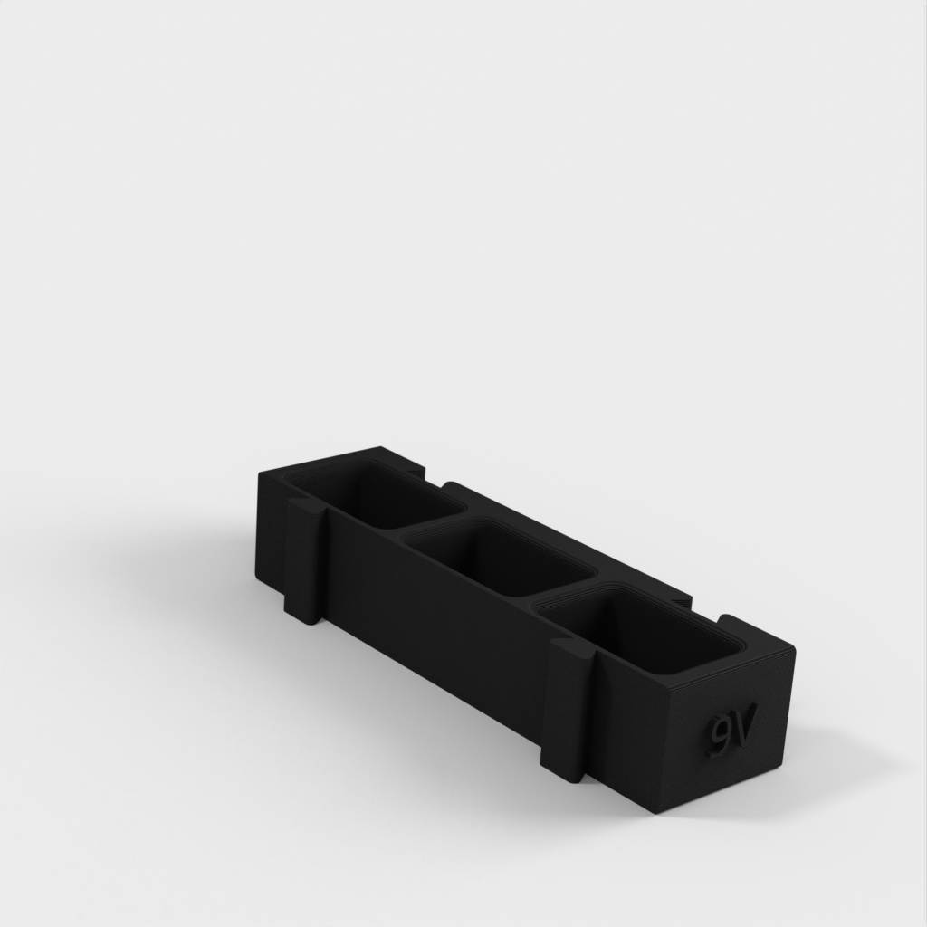 Jedná se o modulární držák baterií, který nabízí různé držáky pro jednotlivé typy baterií. Všechny držáky mají stejnou délku a lze je k sobě připnout v libovolné kombinaci. Je to ideální řešení, jak si uspořádat stůl a mít přehled o bateriích. Přidáním držáku na baterie AA a držáku na mince do sbírky se jeho funkčnost ještě zvýší.