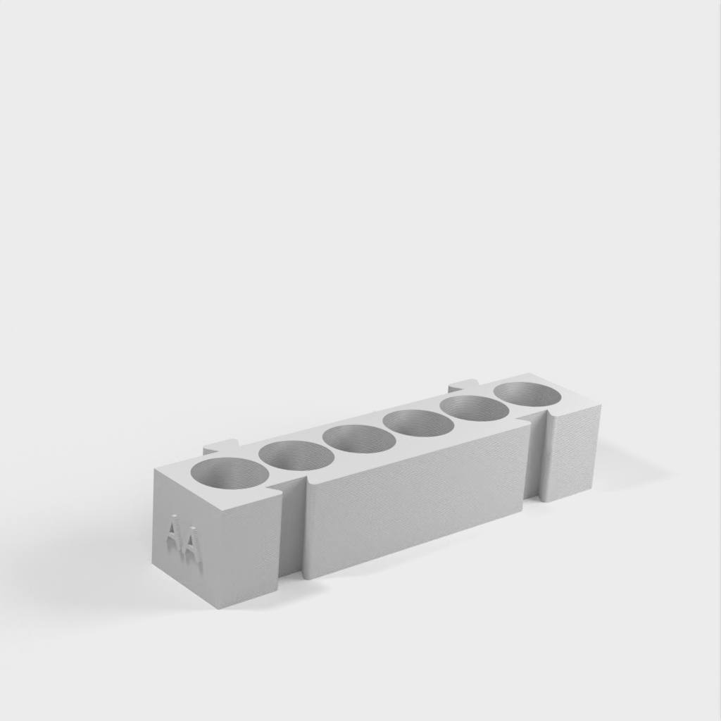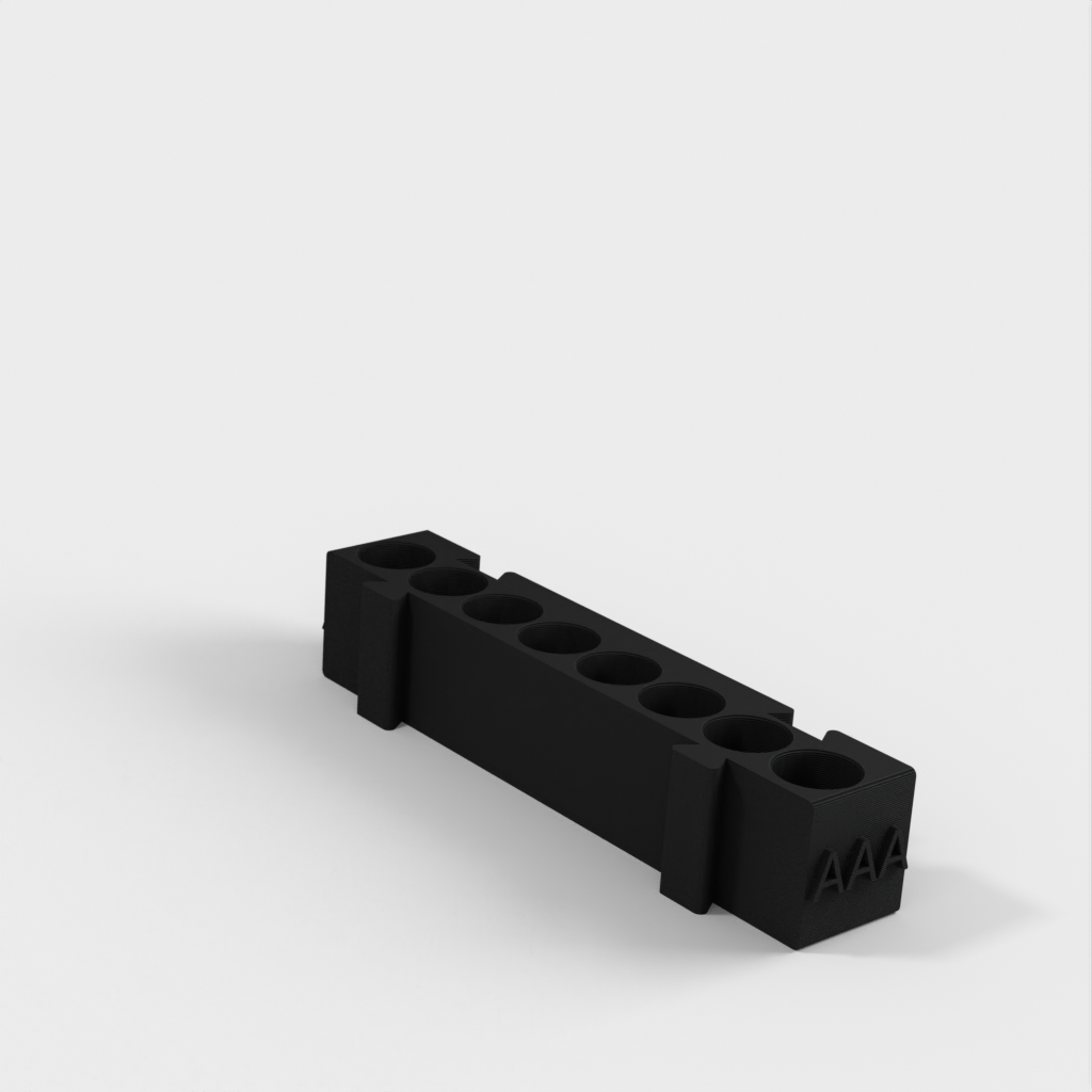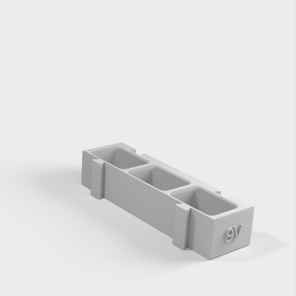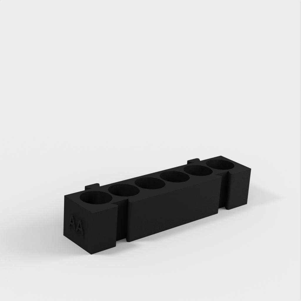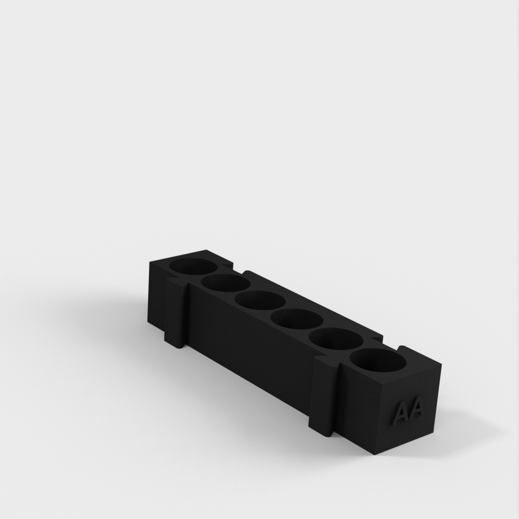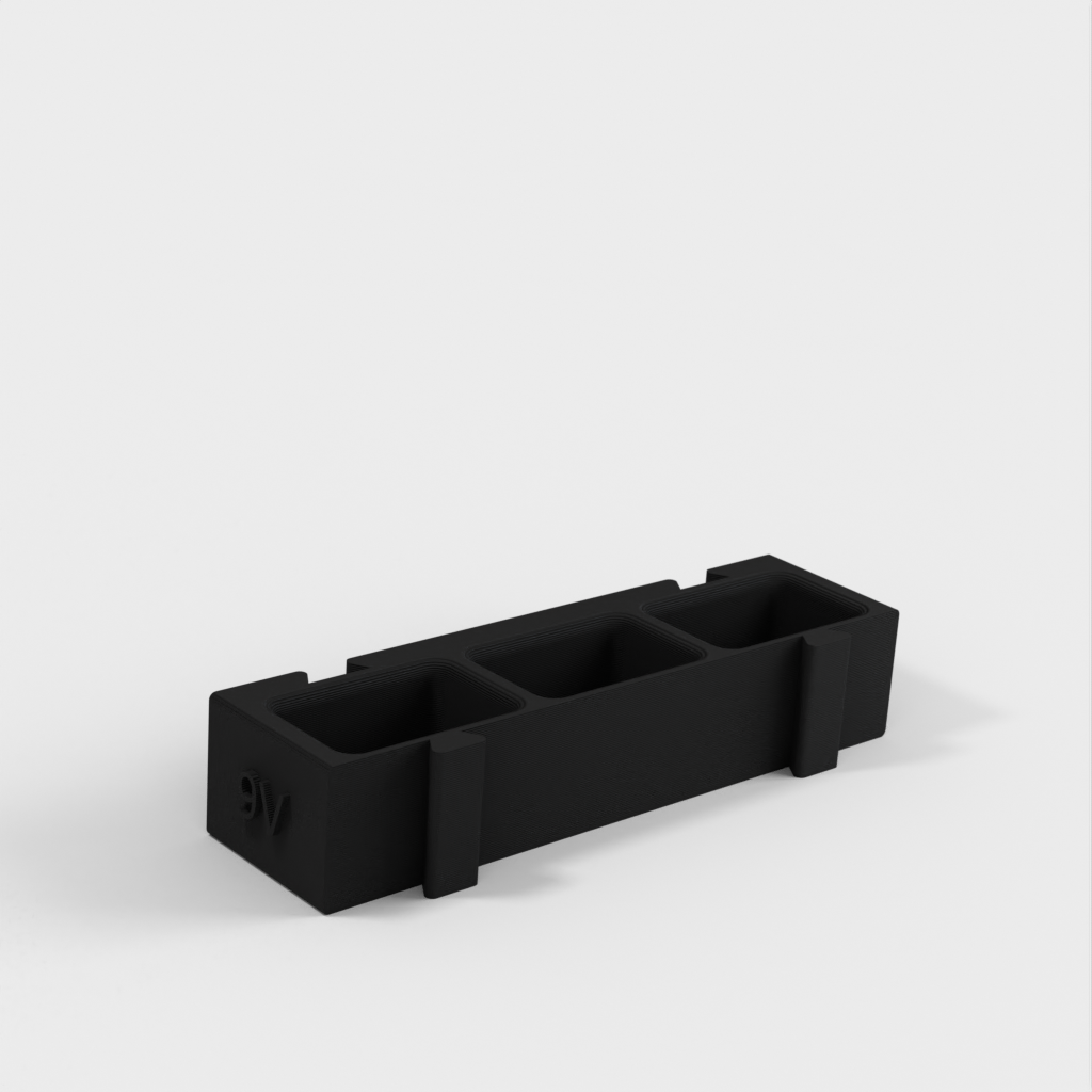 Jedná se o modulární držák baterií, který nabízí různé držáky pro jednotlivé typy baterií. Všechny držáky mají stejnou délku a lze je k sobě připnout v libovolné kombinaci. Je to ideální řešení, jak si uspořádat stůl a mít přehled o bateriích. Přidáním držáku na baterie AA a držáku na mince do sbírky se jeho funkčnost ještě zvýší.