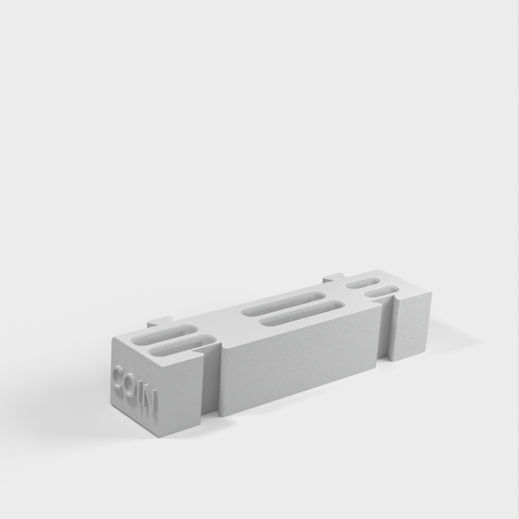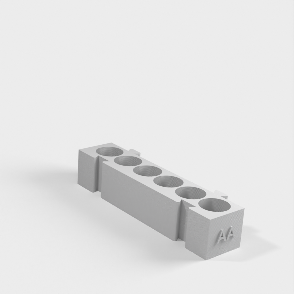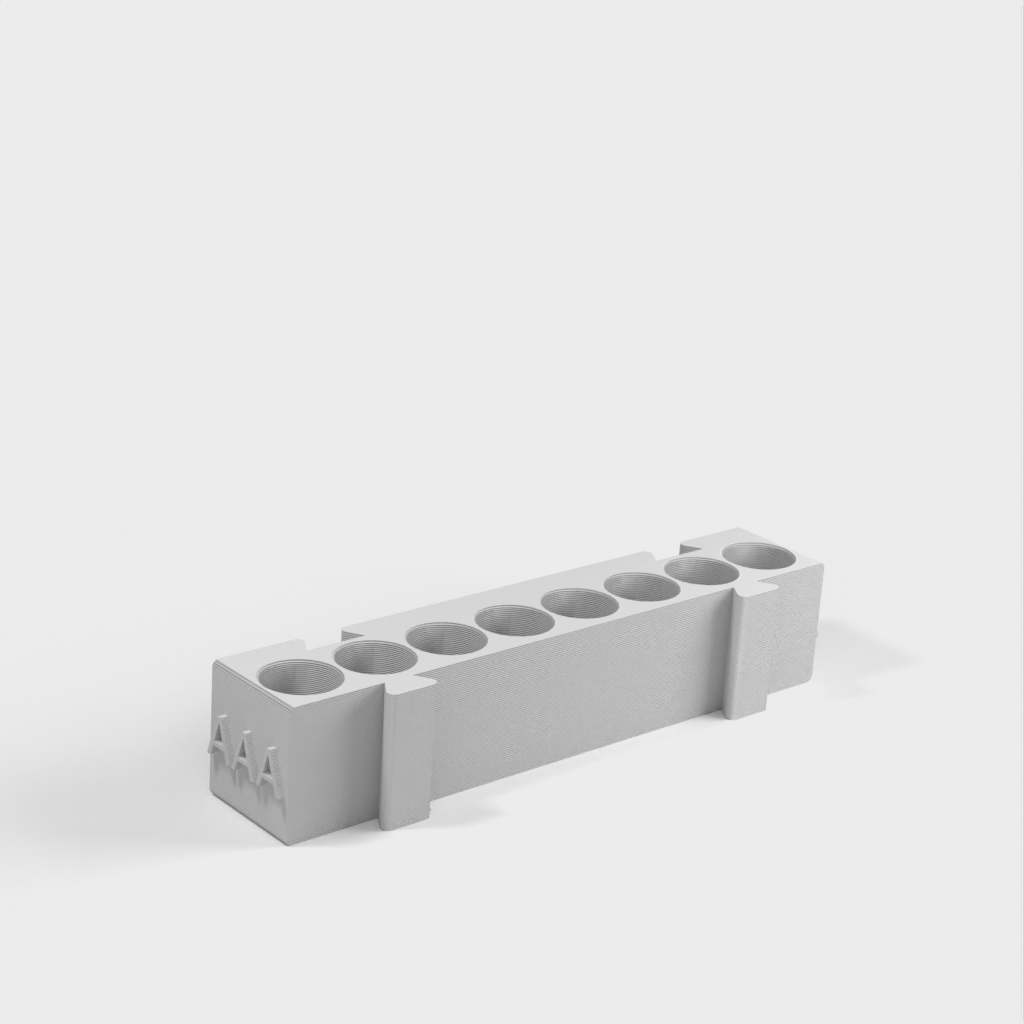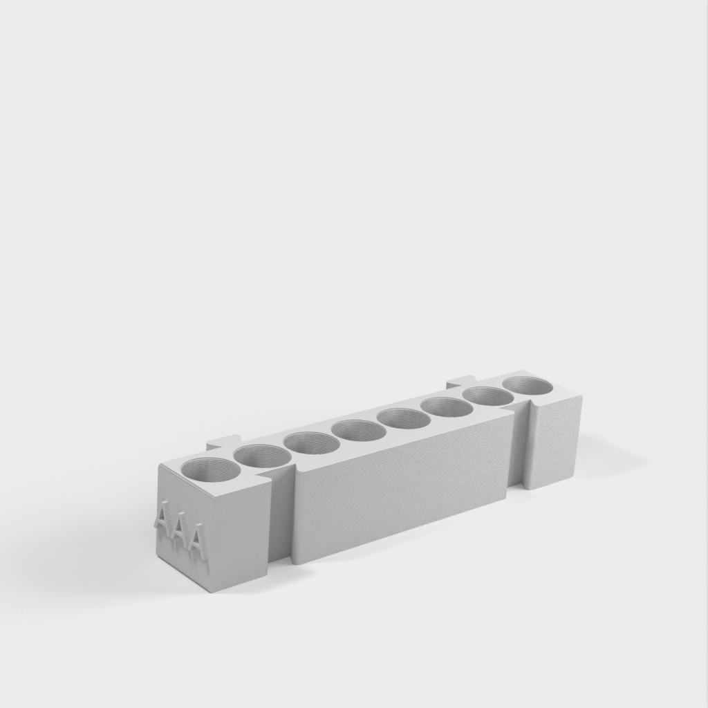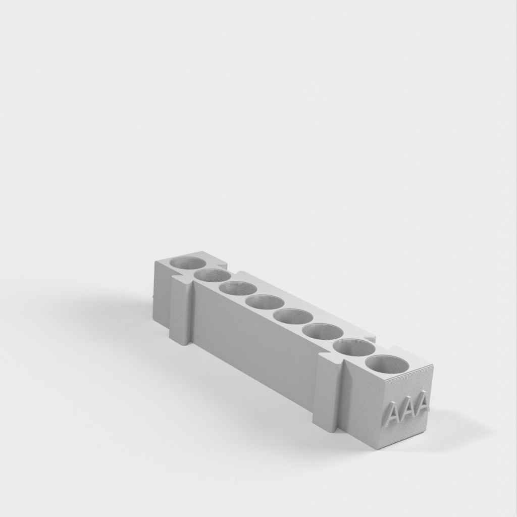 Jedná se o modulární držák baterií, který nabízí různé držáky pro jednotlivé typy baterií. Všechny držáky mají stejnou délku a lze je k sobě připnout v libovolné kombinaci. Je to ideální řešení, jak si uspořádat stůl a mít přehled o bateriích. Přidáním držáku na baterie AA a držáku na mince do sbírky se jeho funkčnost ještě zvýší.