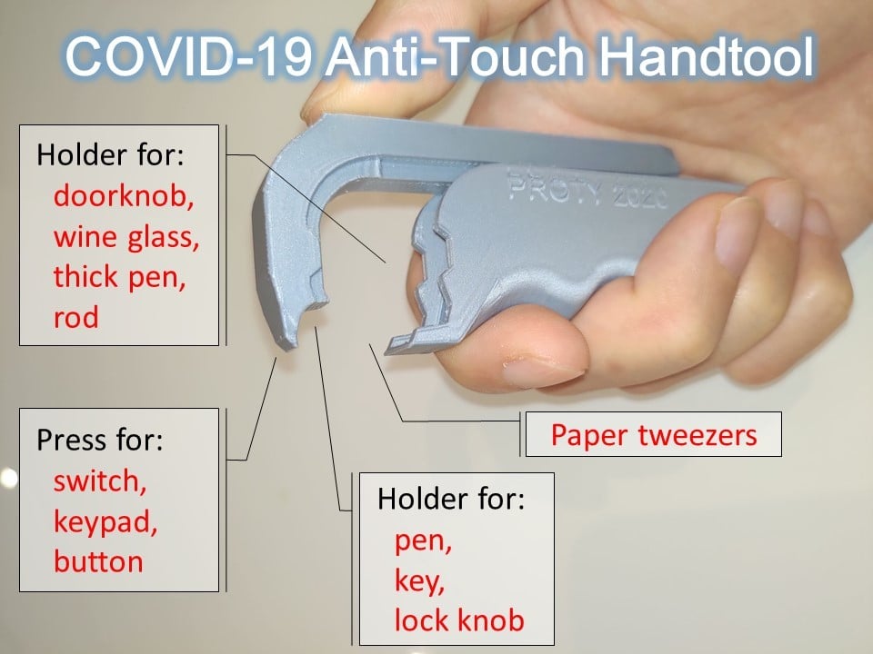 Tento multifunkční nástroj bez trubek nabízí v dnešní době COVID-19 snadné řešení každodenních problémů. Díky mnoha funkcím dokáže tento nástroj otevírat dveře, držet sklenice na víno, otáčet knoflíky zámků, mačkat posunovače, klávesnice nebo jakýkoli druh tlačítek a funguje jako držák (tlustého/tenkého) pera. Kromě toho jej lze použít jako pinzetu na papírování v kanceláři, jako držák klíčů, a dokonce i jako držák hůlky.