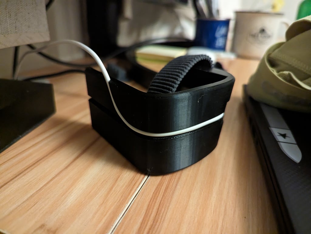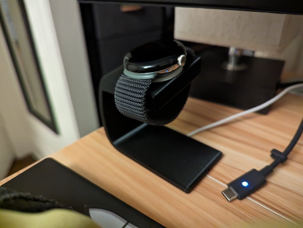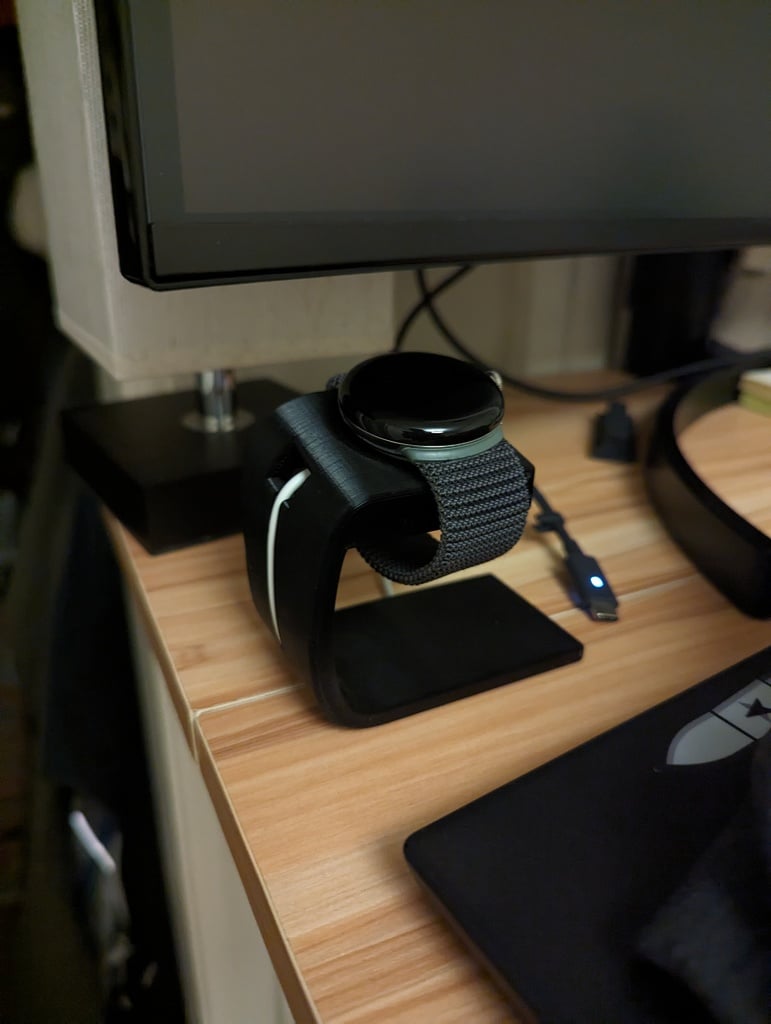 Stojan integruje bezpečný prostor pro indukční nabíječku a vestavěný držák kabelu zajišťuje skryté vedení kabelu, čímž se snižuje nepořádek na stole nebo nočním stolku. Díky tomu je stojan efektivním držákem kabelů. Je speciálně upraven tak, aby se do něj vešly hodinky s roztažitelnými pásky, ale jeho design zajišťuje, že bude optimálně fungovat se všemi typy pásků Pixel Watch.