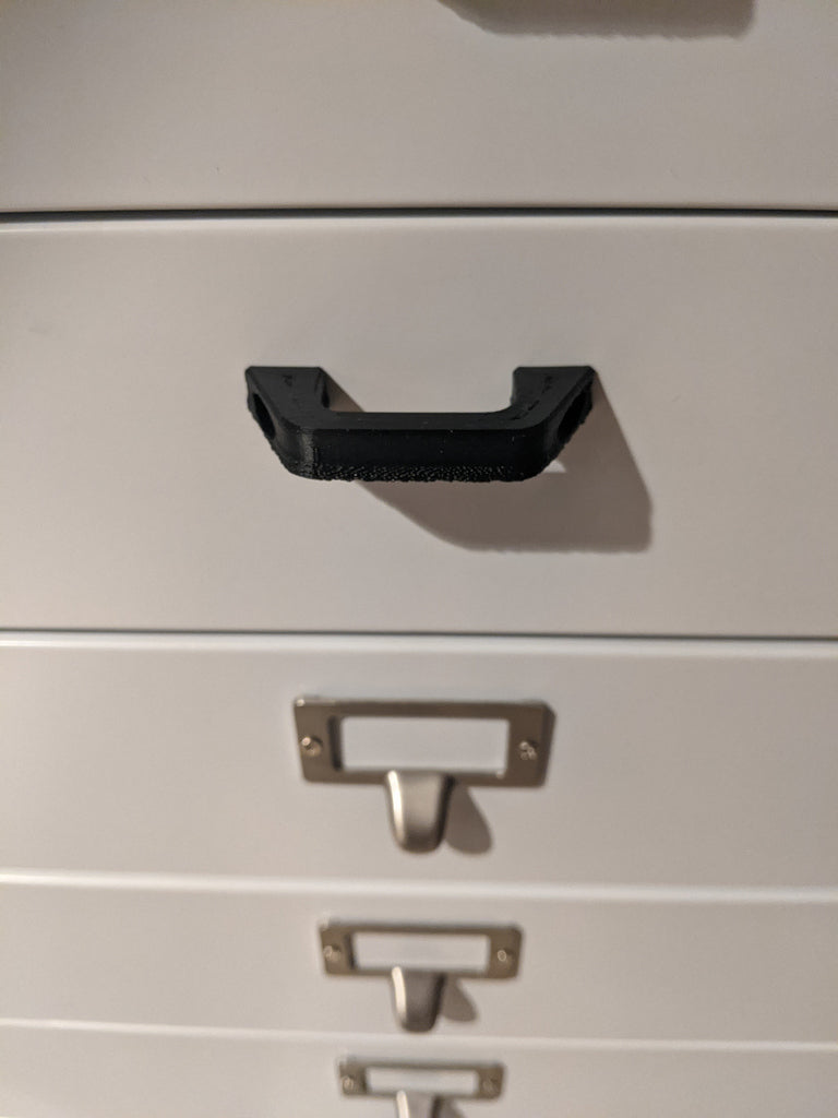 Náhradní rukojeť pro vozík Home Decorators Collection Becker. Vyrobeno tak, aby se hodilo ke kterémukoli z řady úložných vozíků Home Decorators Collection Becker s více zásuvkami. Nahrazuje původní, velmi křehké rukojeti ve stylu skříněk na dokumenty, přičemž se používají původní šrouby. Otvory jsou uprostřed od sebe vzdáleny 52 mm.