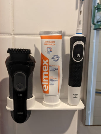 Držák je přizpůsoben tak, aby pojal oblíbené modely, jako jsou holicí strojky Braun S3 3000s a zubní kartáčky Elmex, a jeho design také umožňuje, aby se hodil pro mnoho dalších standardních elektrických zubních kartáčků a jejich souvisejících hlavic a také pro různé typy holicích strojků. Montáží předmětů na stěnu snížíte nepořádek na umyvadle a přispějete k efektivnějšímu a hygieničtějšímu koupelnovému prostředí. Funkční řešení pro dobře uspořádaný domov.