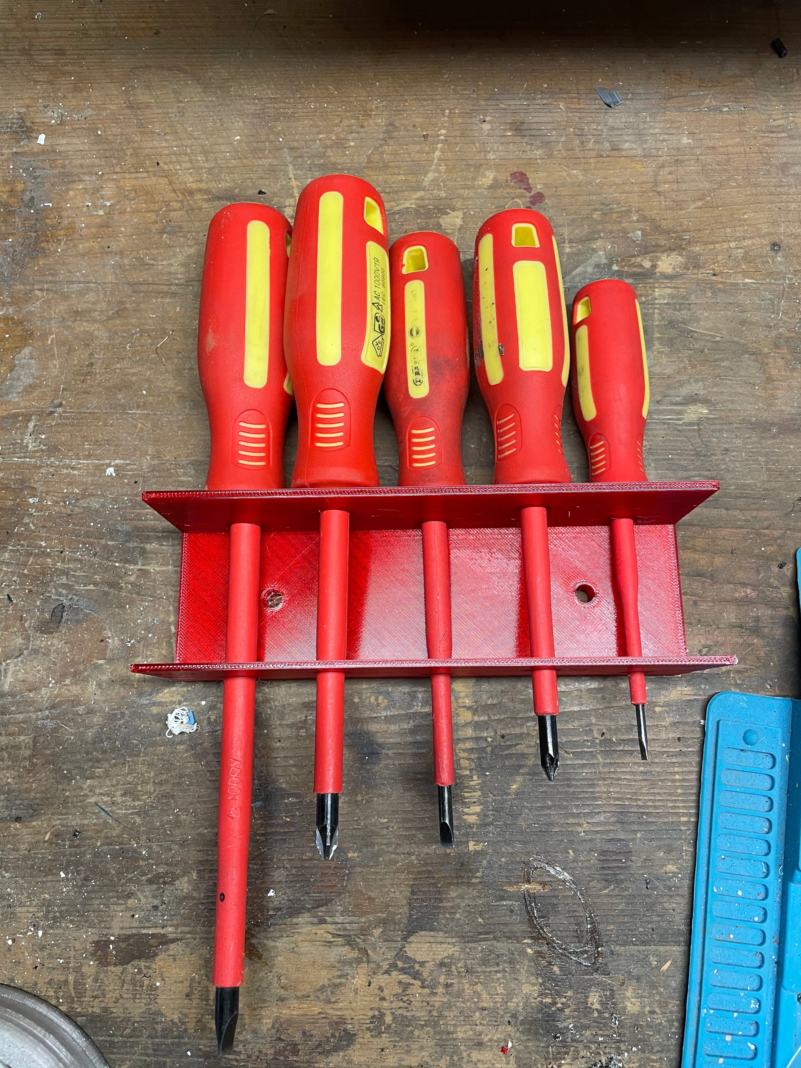 Nástěnný držák šroubováků se doporučuje pro větší šroubováky. Lze jej snadno připevnit na stěnu pomocí šroubů, díky čemuž bude vaše dílna nebo pracovní prostor přehlednější a organizovanější. Držák je pevný a odolný, ideální pro uložení a organizaci nářadí.