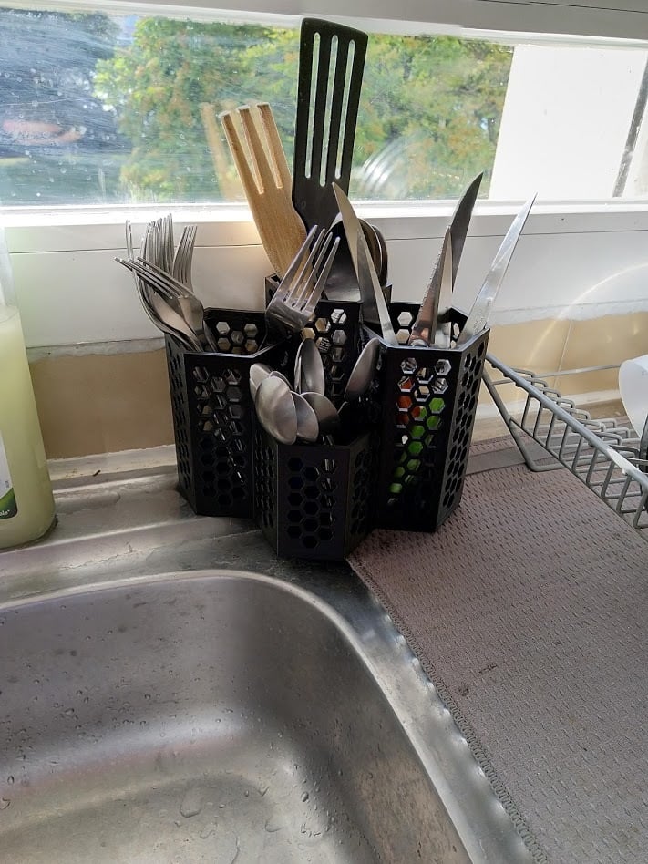 Praktický odkapávač na příbory rozdělený do čtyř boxů: jeden na malé lžičky, jeden na vidličky, jeden na nože a větší box na větší lžíce a další kuchyňské náčiní. Malé otvory ve dně napomáhají odtoku vody.