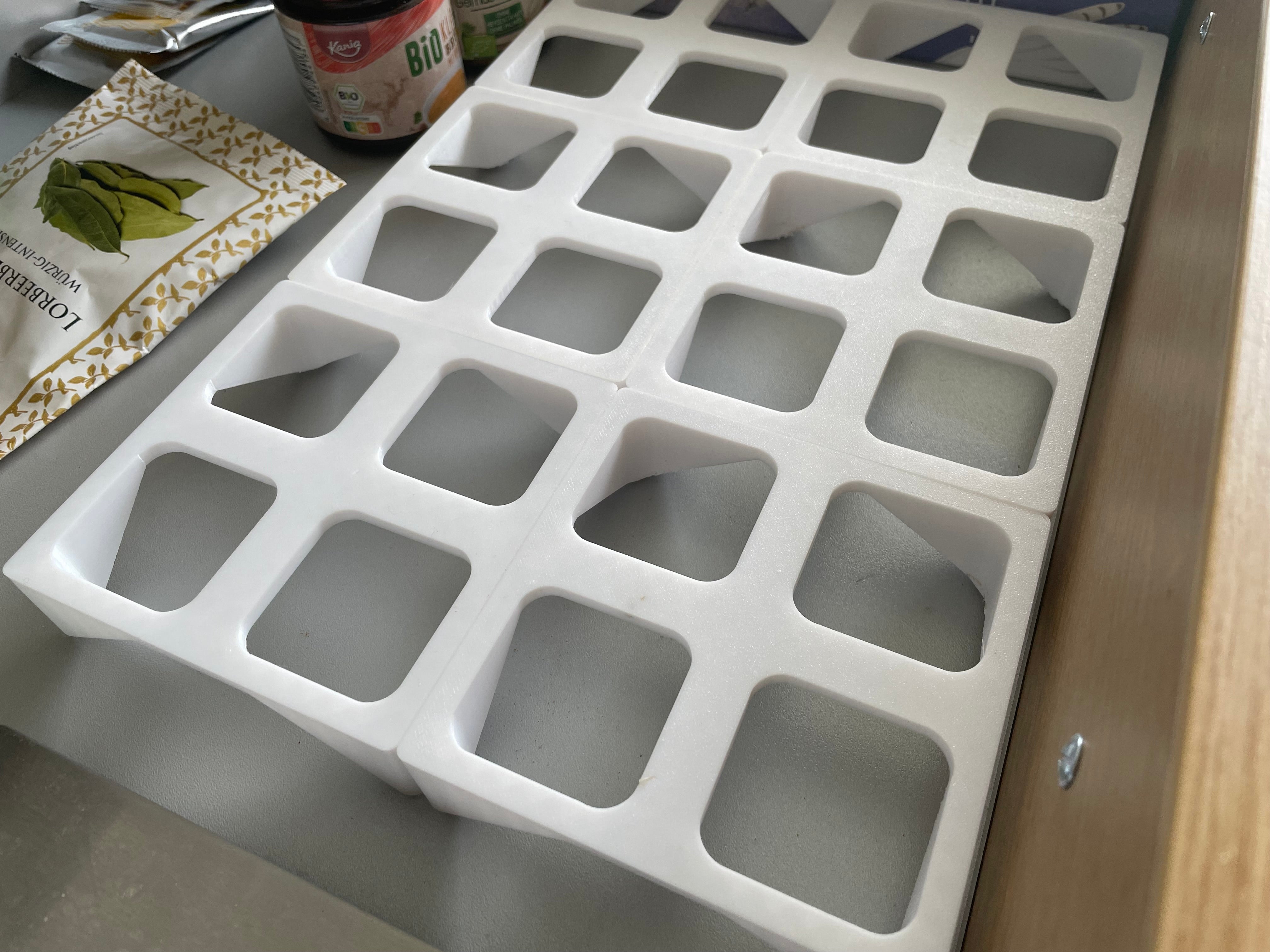 Úložný systém na koření lze tisknout v různých velikostech, aby se vešel do vaší zásuvky. S drážkami na spodní straně můžete snadno spojit několik jednotek a vytvořit větší systém, což zvyšuje vaši skladovací kapacitu. Přidejte podložky na nohy pro dodatečnou stabilitu a ochranu vašich povrchů.