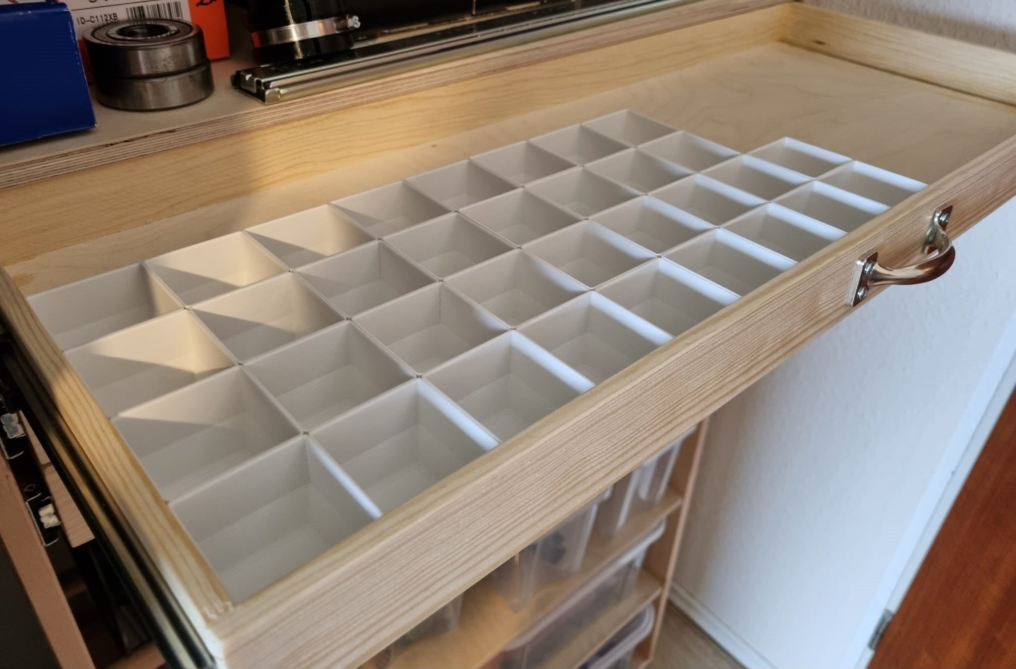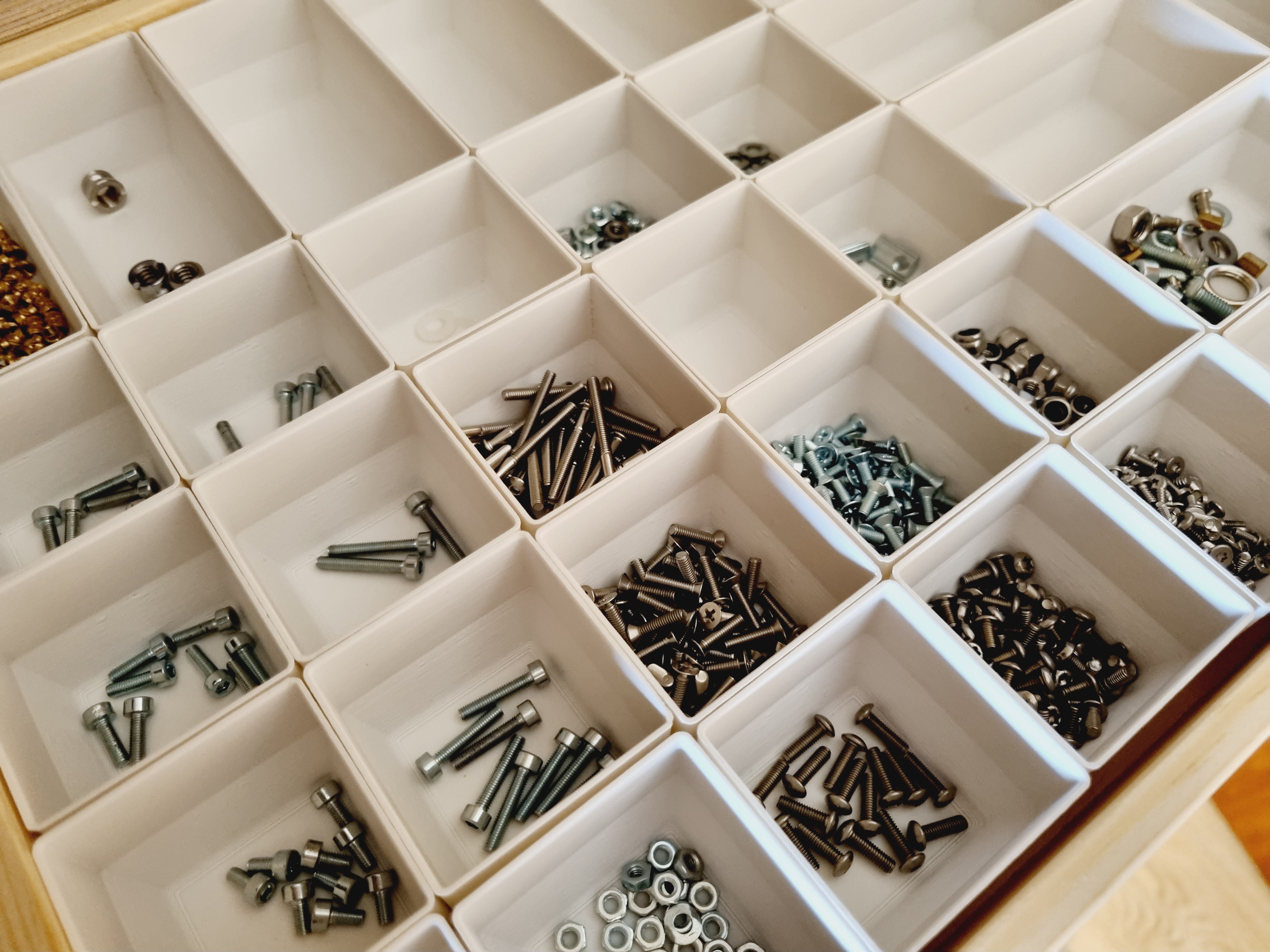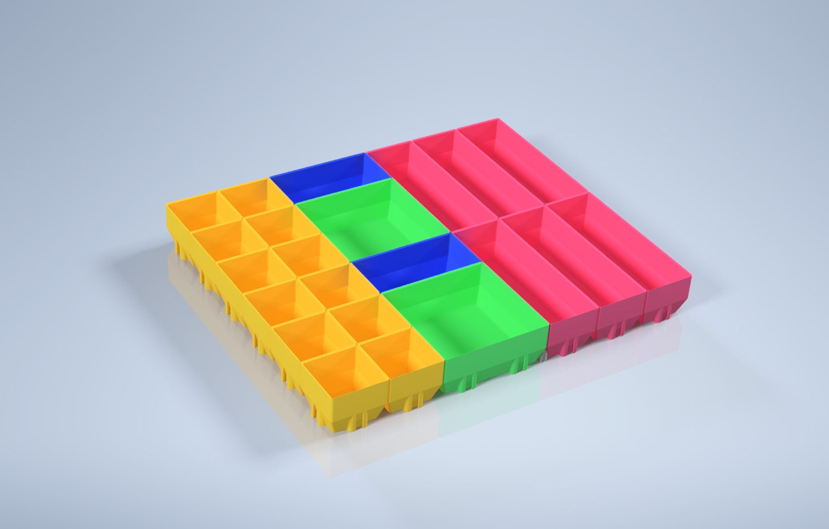 Tento organizér na drobné díly je určen k uspořádání zásuvky na šroubky a matice. Nejmenší z nich má rozměry 45 x 45 mm a další následují po násobcích tohoto rozměru: 2x1, 2x2 a 3x1. Lze je spojit malým konektorem.'