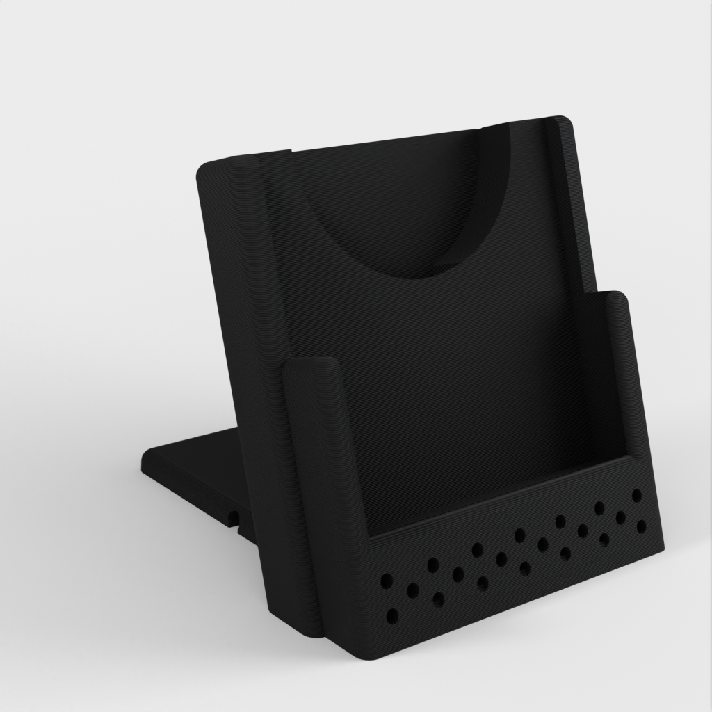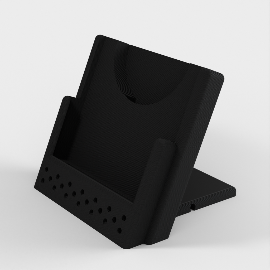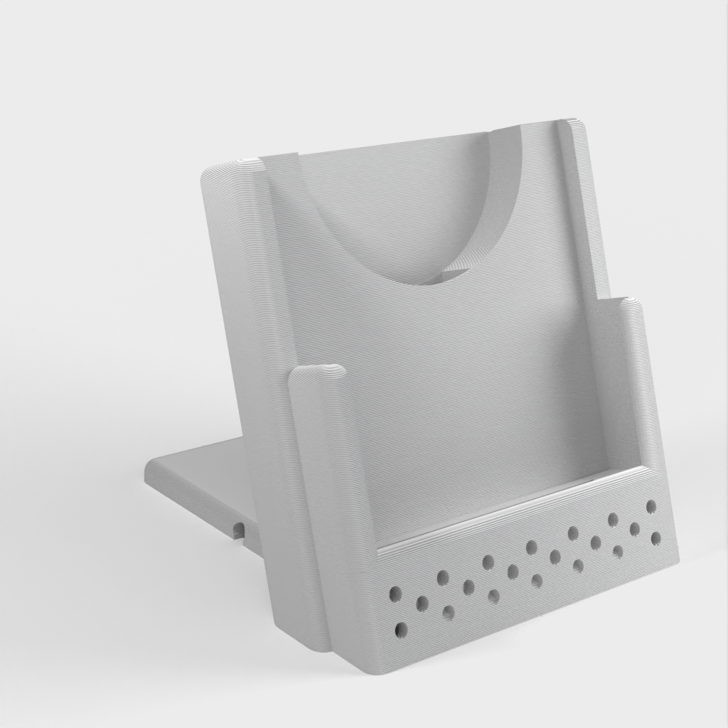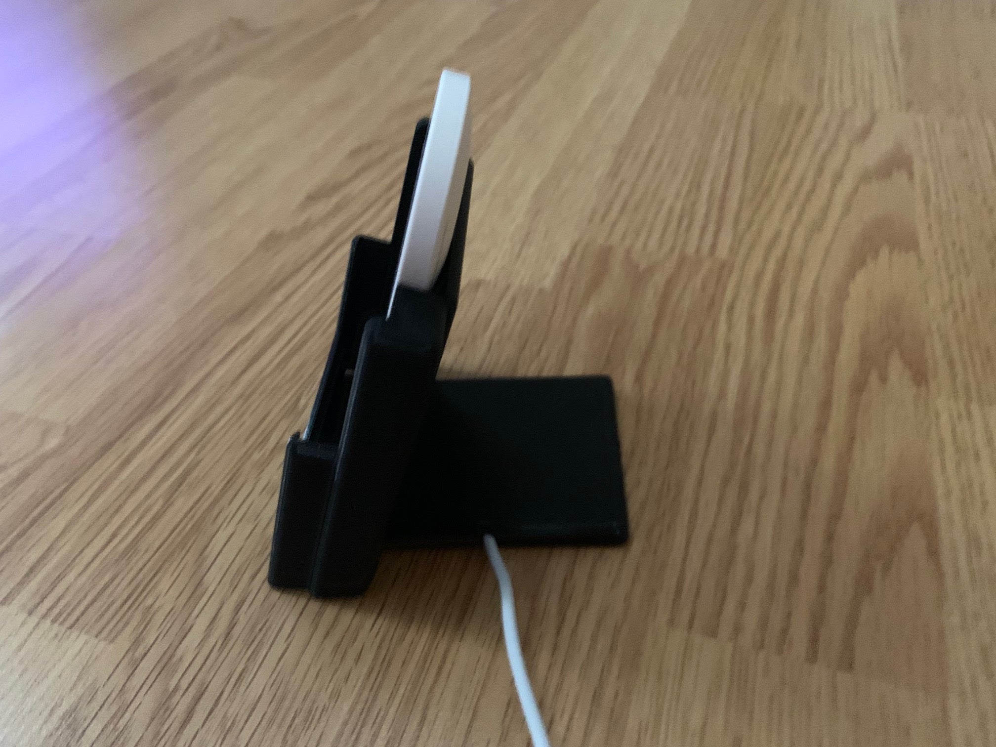 Tady je přizpůsobitelný bezdrátový nabíjecí stojan pro telefon. Má konstrukci s nastavitelnými vodítky kabelu, která umožňují zvolit, zda kabel vystupuje z nabíječky doleva, doprava nebo dozadu. Lze jej přizpůsobit tak, aby vyhovoval iPhonu XS s nabíječkou třetí strany, ale lze jej také snadno upravit tak, aby vyhovoval jakékoli jiné kombinaci telefonu a nabíječky.