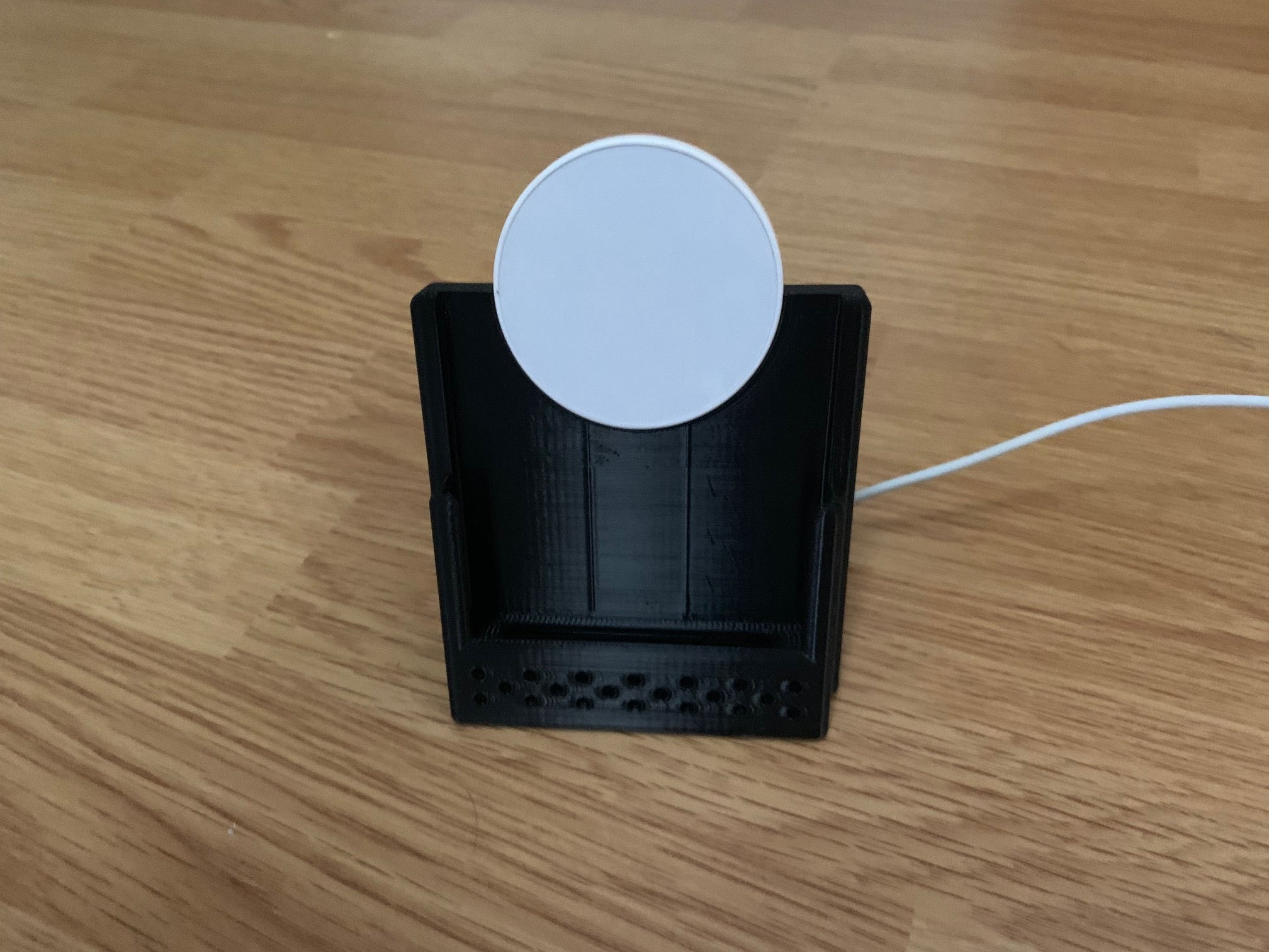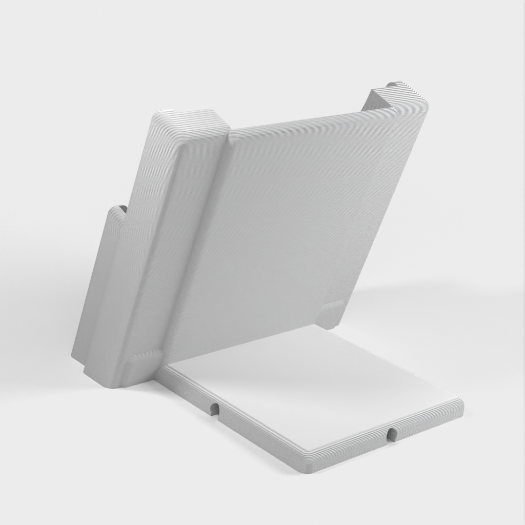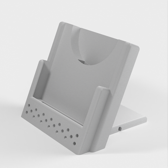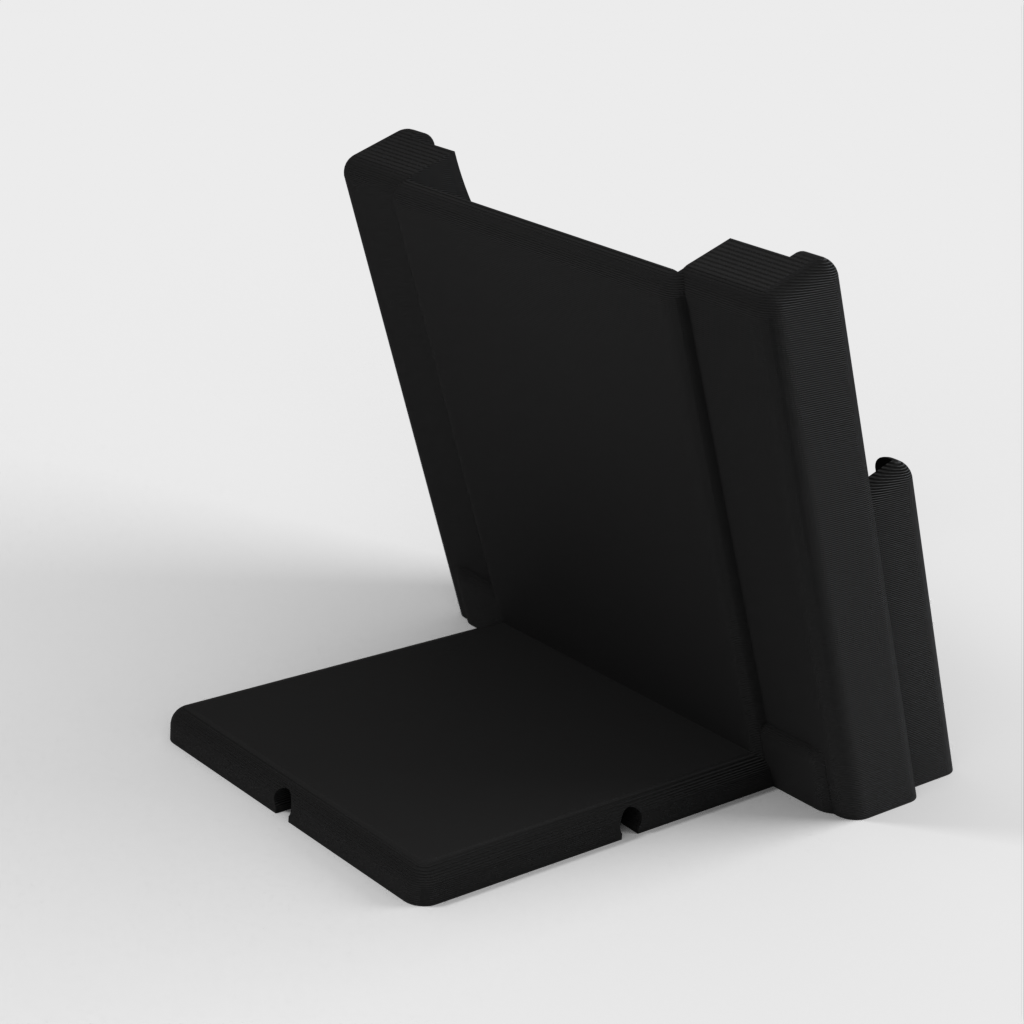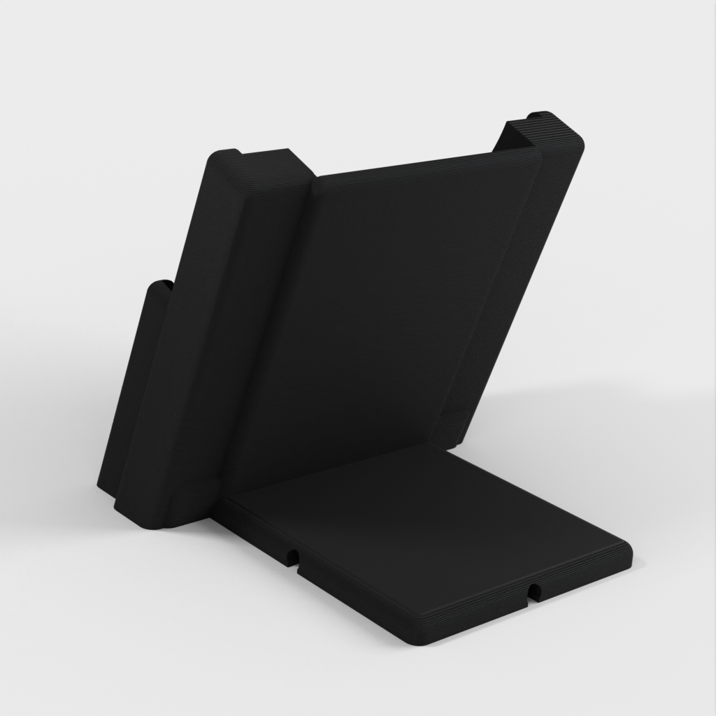 Tady je přizpůsobitelný bezdrátový nabíjecí stojan pro telefon. Má konstrukci s nastavitelnými vodítky kabelu, která umožňují zvolit, zda kabel vystupuje z nabíječky doleva, doprava nebo dozadu. Lze jej přizpůsobit tak, aby vyhovoval iPhonu XS s nabíječkou třetí strany, ale lze jej také snadno upravit tak, aby vyhovoval jakékoli jiné kombinaci telefonu a nabíječky.