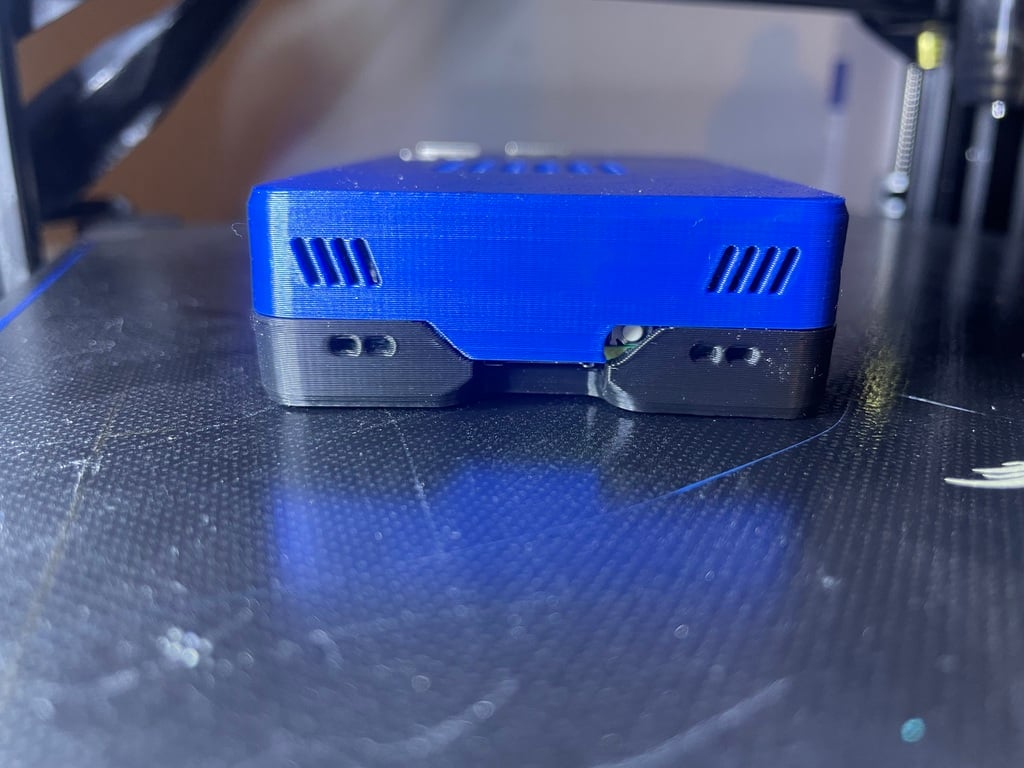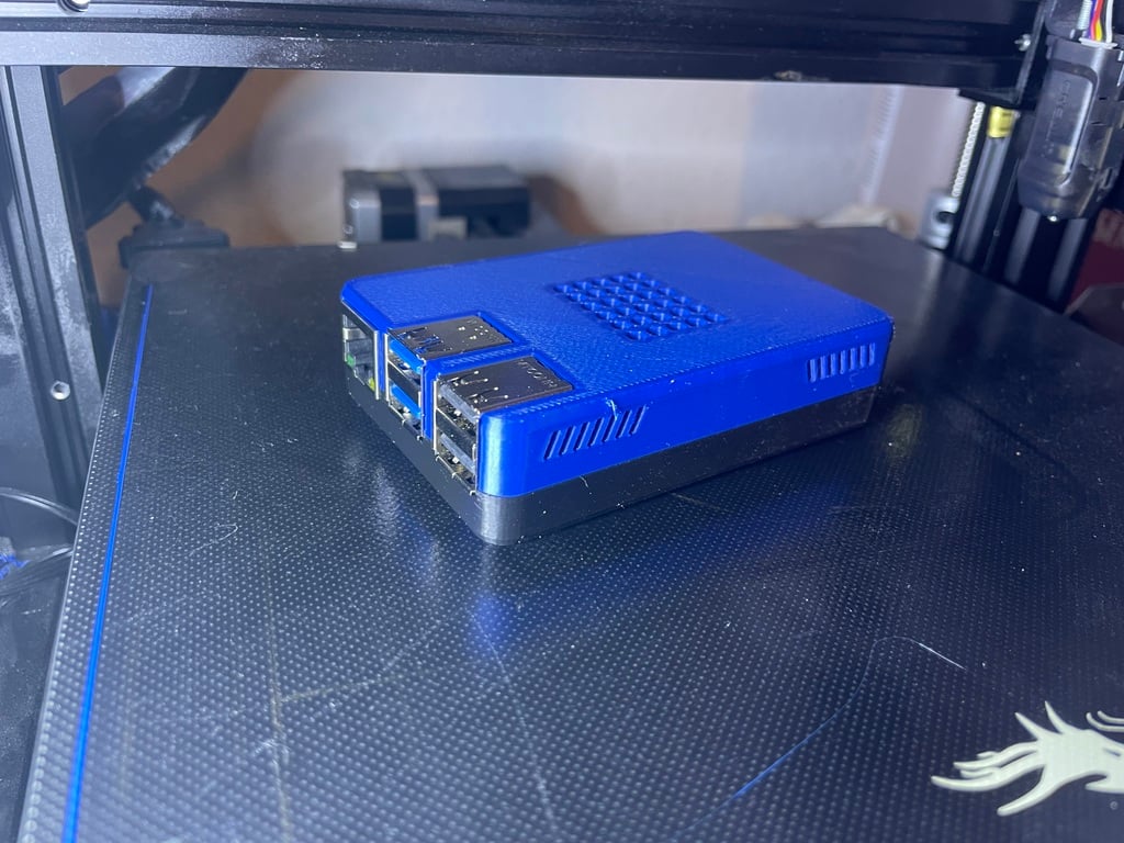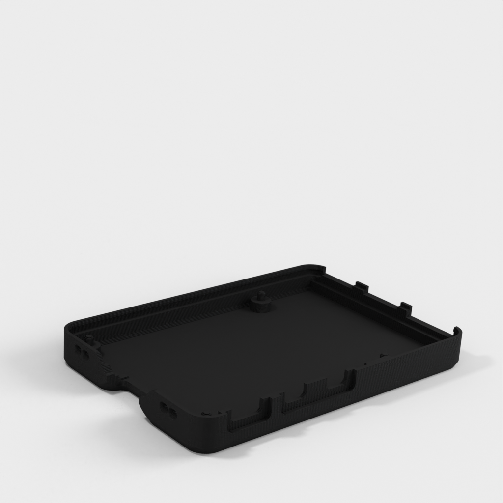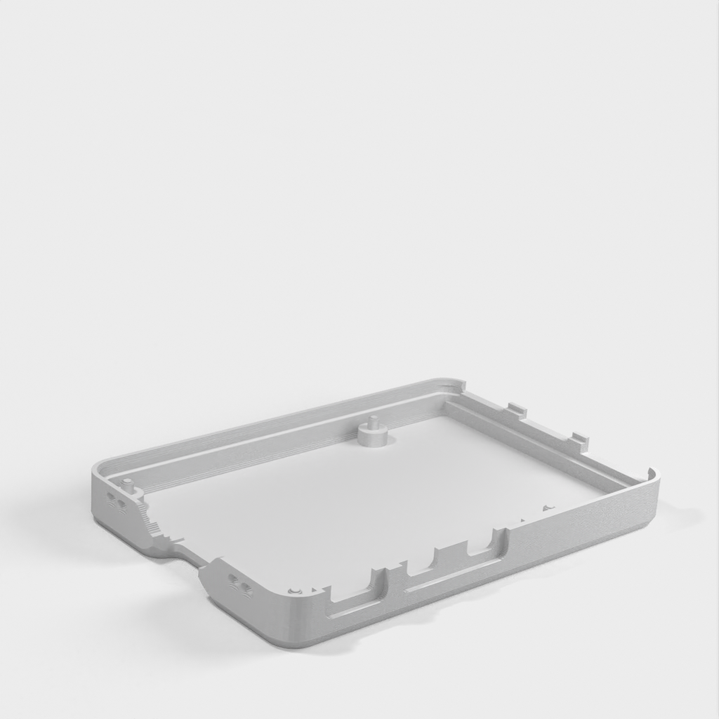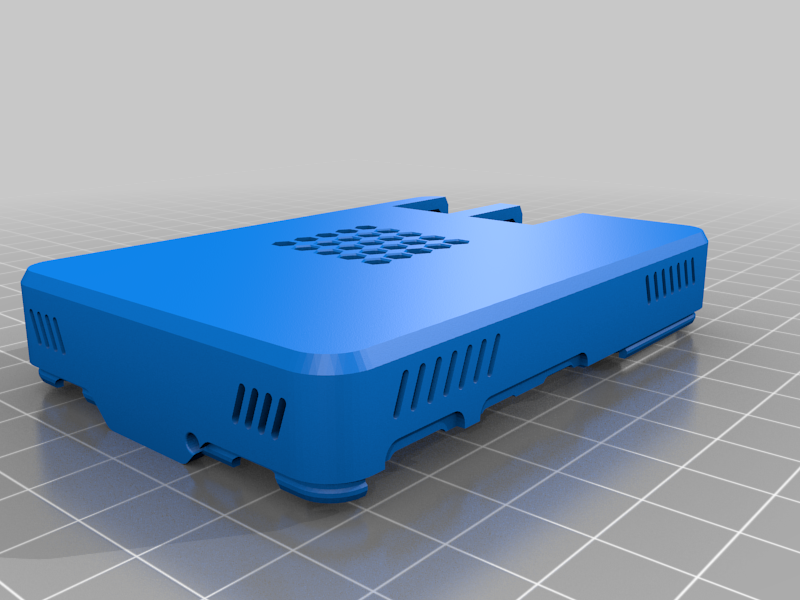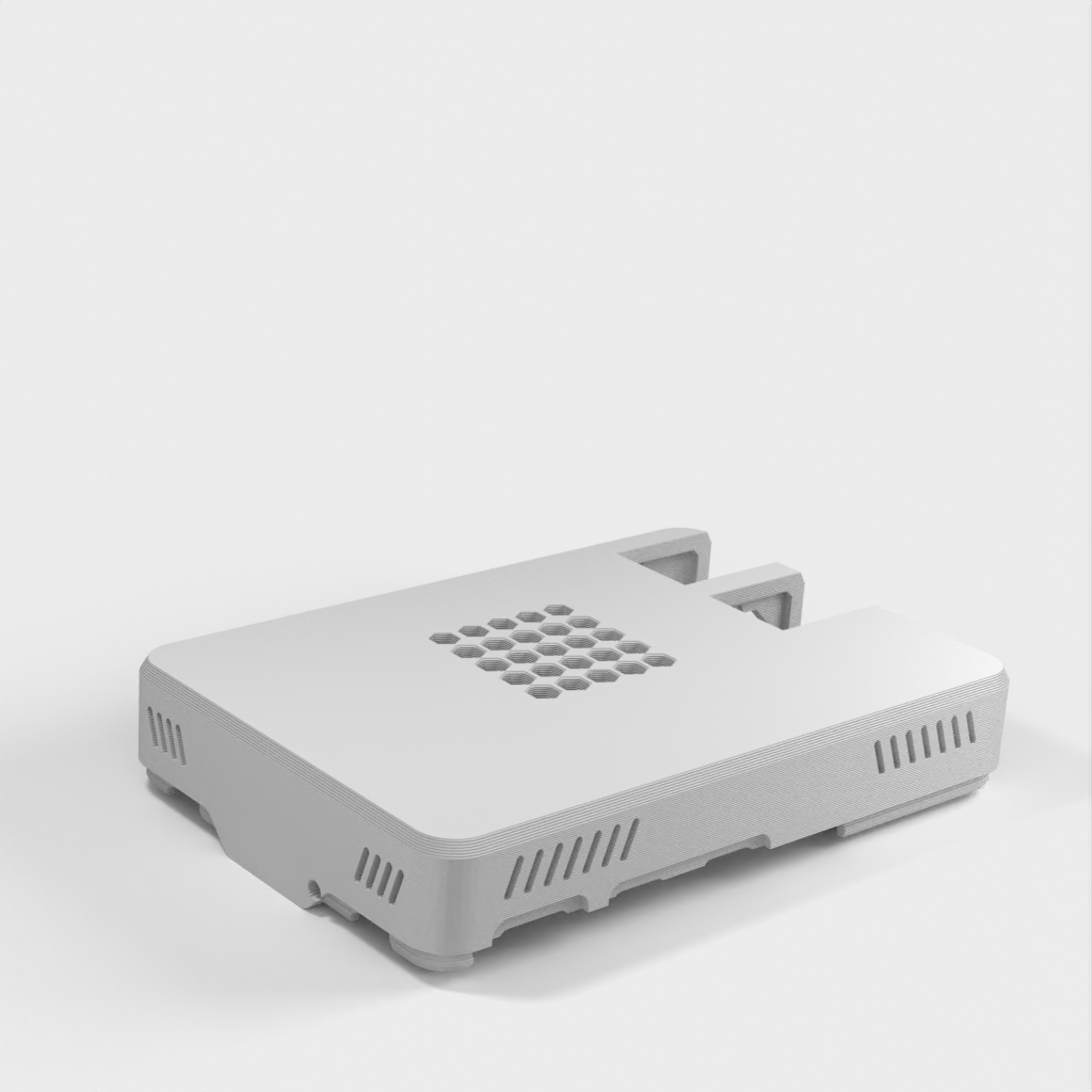 Jednoduchý kryt pro Raspberry Pi 5 z roku 2023. Změny zahrnují přemístění konektorů USB a LAN, odstranění konektoru pro sluchátka a přidání malého otvoru pro tlačítko reset. Byly přidány větrací otvory, aby se do nich vešel původní chladič.
