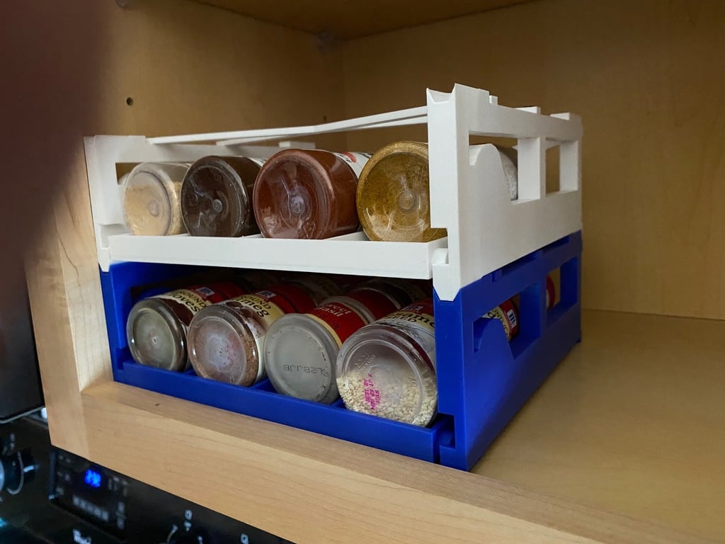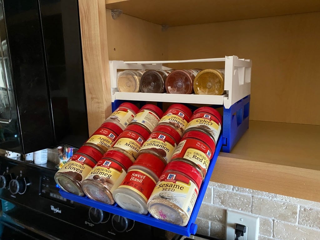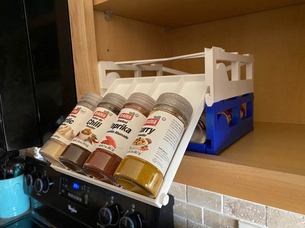 - Efektivní organizér lahviček s kořením v kuchyni.