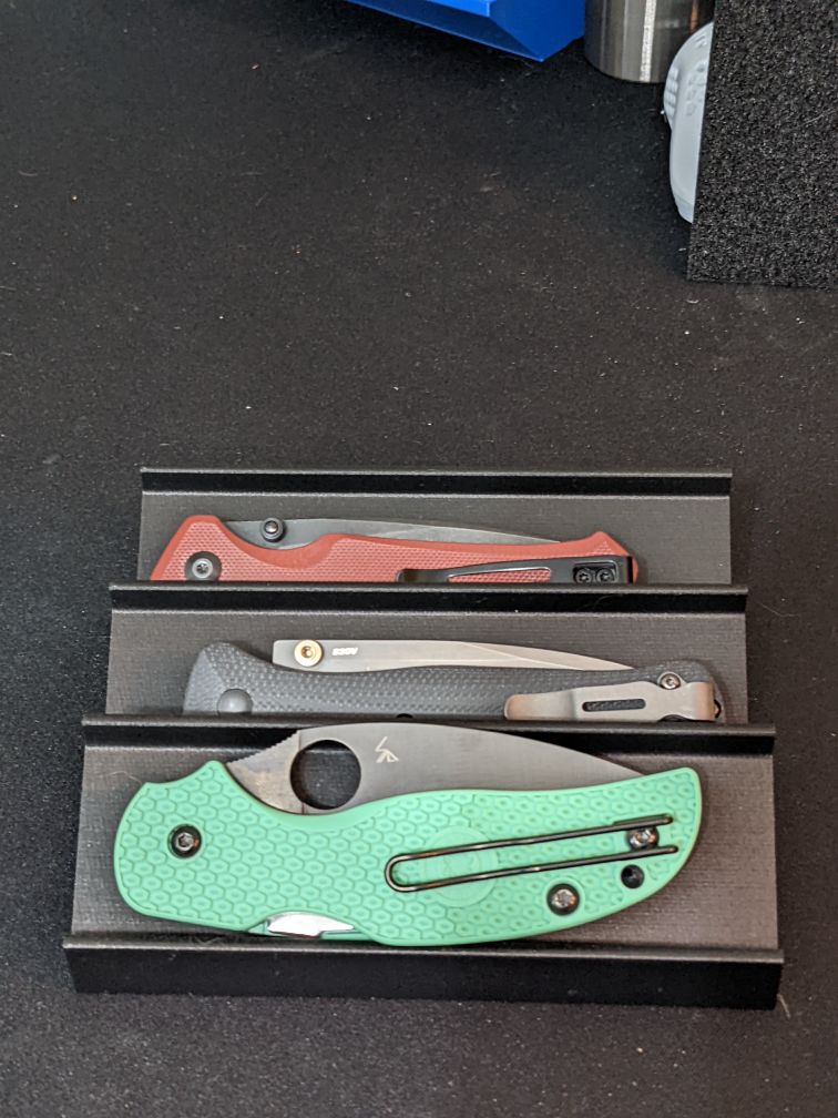 Stojan je univerzálně navržen tak, aby pojal většinu standardních kapesních nožů, což z něj činí všestrannou volbu pro sběratele i každodenní uživatele, kteří chtějí pořádek a přehled.