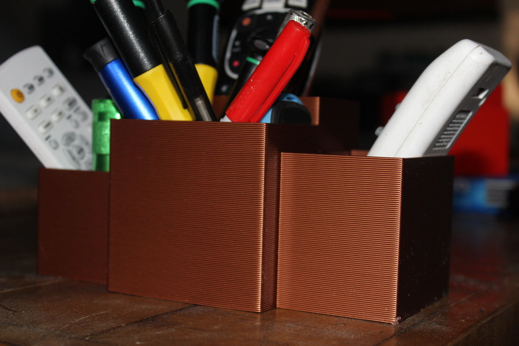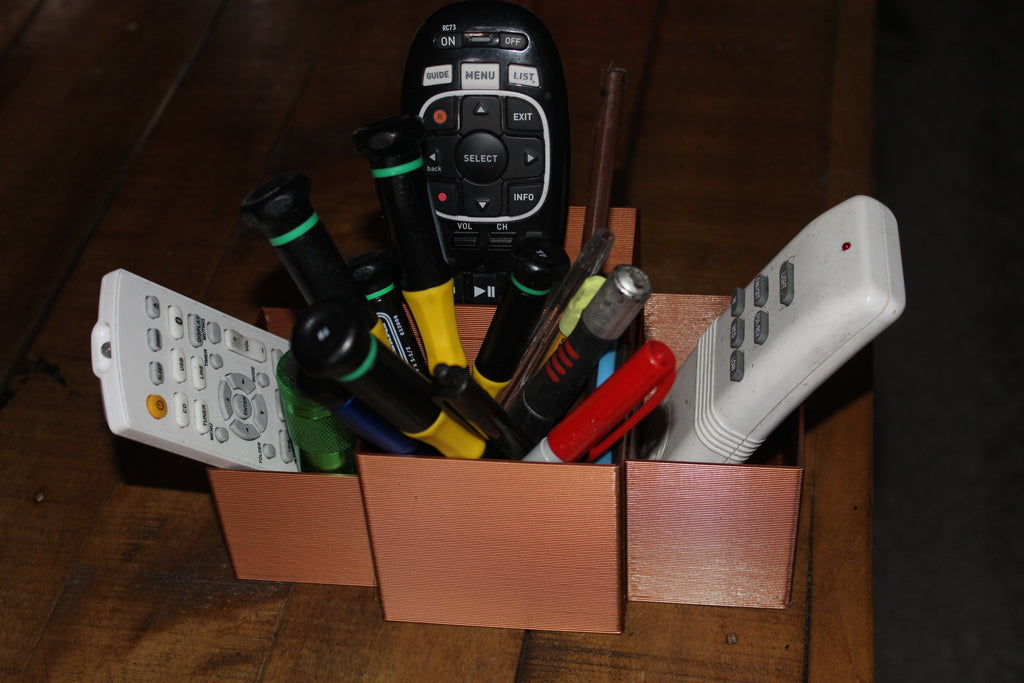 Toto je držák na dálkové ovládání na stůl. Je ideální pro udržování pořádku ve vašich dálkových ovladačích a dalších drobných předmětech, jako jsou pera, tužky atd. Stačí vložit dálkové ovládání nebo cokoli, co se vejde do držáku, a máte vše uspořádané na jednom místě.